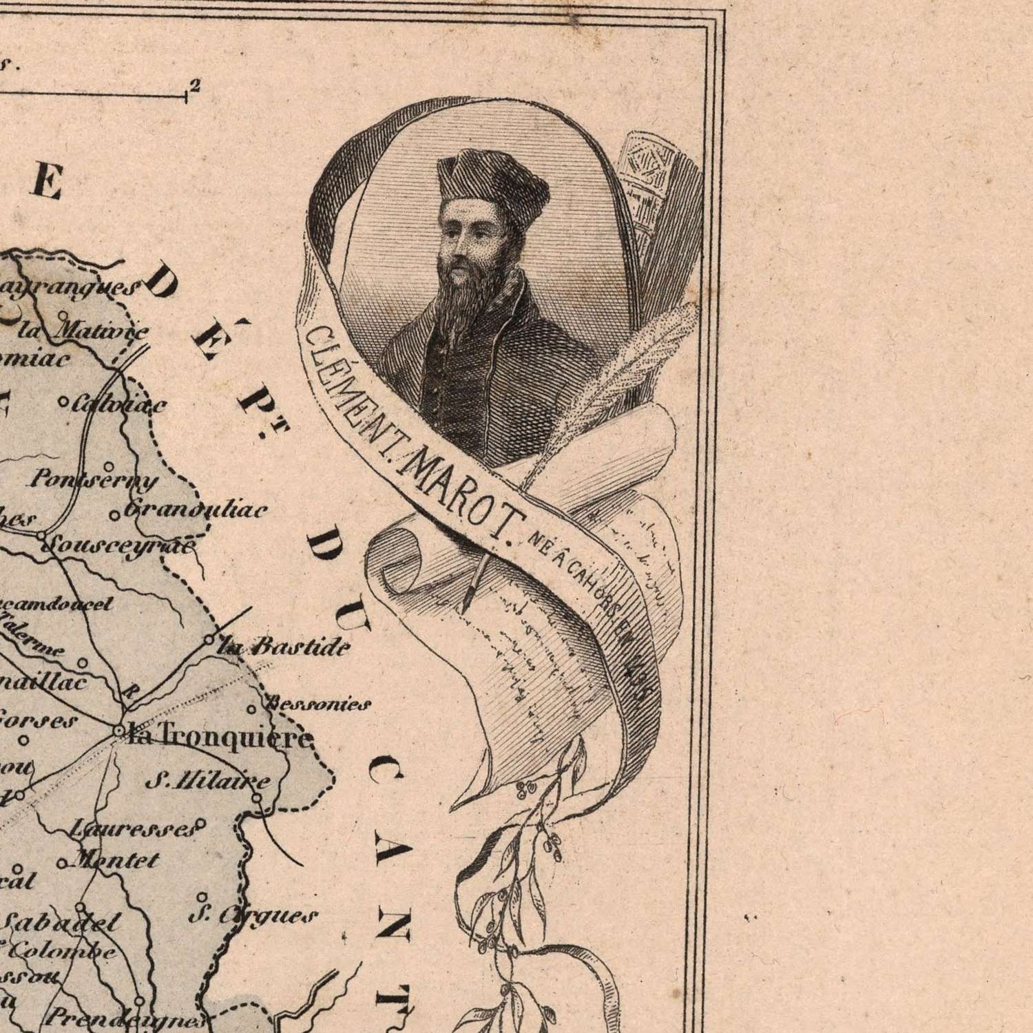 Vuillemin was among the 19th century’s most persuasive cartographic storytellers, and here his hand is unmistakable. Decorative borders teem with vignettes—pastoral herds, market bustle, and vineyard labors—that speak to Lot’s agricultural backbone. Heraldic devices of principal towns punctuate the margins, while portraits of learned figures and statesmen lend historical gravitas. The result is not mere ornament; imagery and information collaborate to quicken the reader’s sense of place. Color demarcations guide the eye across arrondissements and communes, but the imagination is carried by the scenes: river craft slipping past arched stone bridges, hillside terraces banded with vines, and rural lanes winding toward fortified hill towns. This stylistic synthesis is Vuillemin’s signature: empirical precision enveloped in theatrical elegance.
