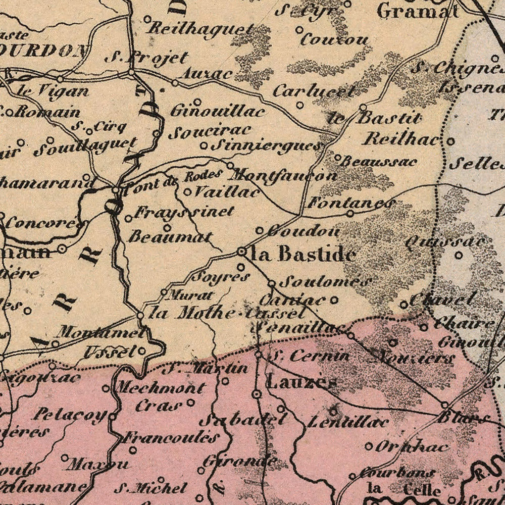 Urban life is distilled into three radiant nodes—Cahors, Figeac, and Gourdon—each anchoring an arrondissement and each emblematic of a different face of Lot. Cahors unfurls within the river’s loop, a medieval city of arches and towers whose renown in wine and commerce resonates across the sheet. Figeac emerges as a scholarly and mercantile hub, long tied to regional exchange and remembered for sons who unlocked the scripts of distant antiquity. Gourdon, poised on its commanding height, surveys the northern approaches. Vuillemin’s labels and boundary lines bind these centers to a network of parishes, roads, and neighboring departments, emphasizing how jurisdictional order and lived geography overlap. Statistical notes—distance measures, demographic summaries, and economic cues—give administrative abstractions palpable human texture.