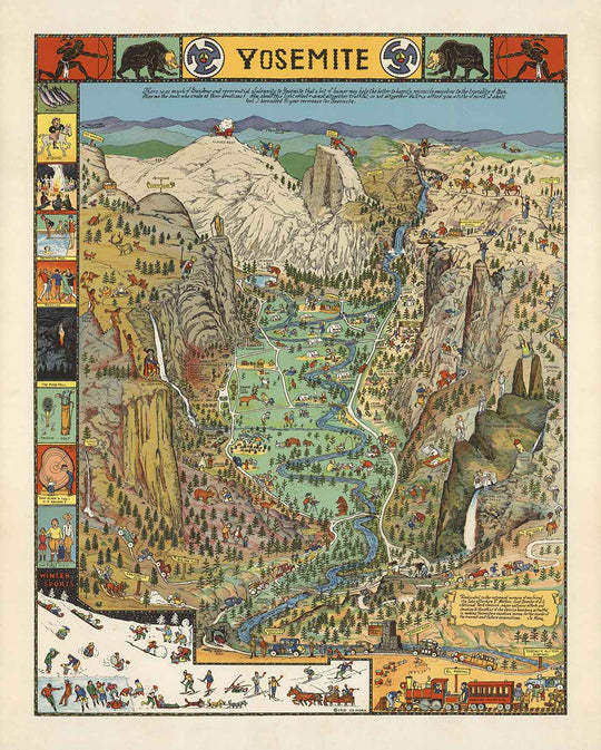 Mappa Pittoresca Antica del Parco Nazionale di Yosemite nel 1941 di Jo Mora: Mirror Lake, Vernal Falls, Nevada Falls, Eagle Peak, Washington Column