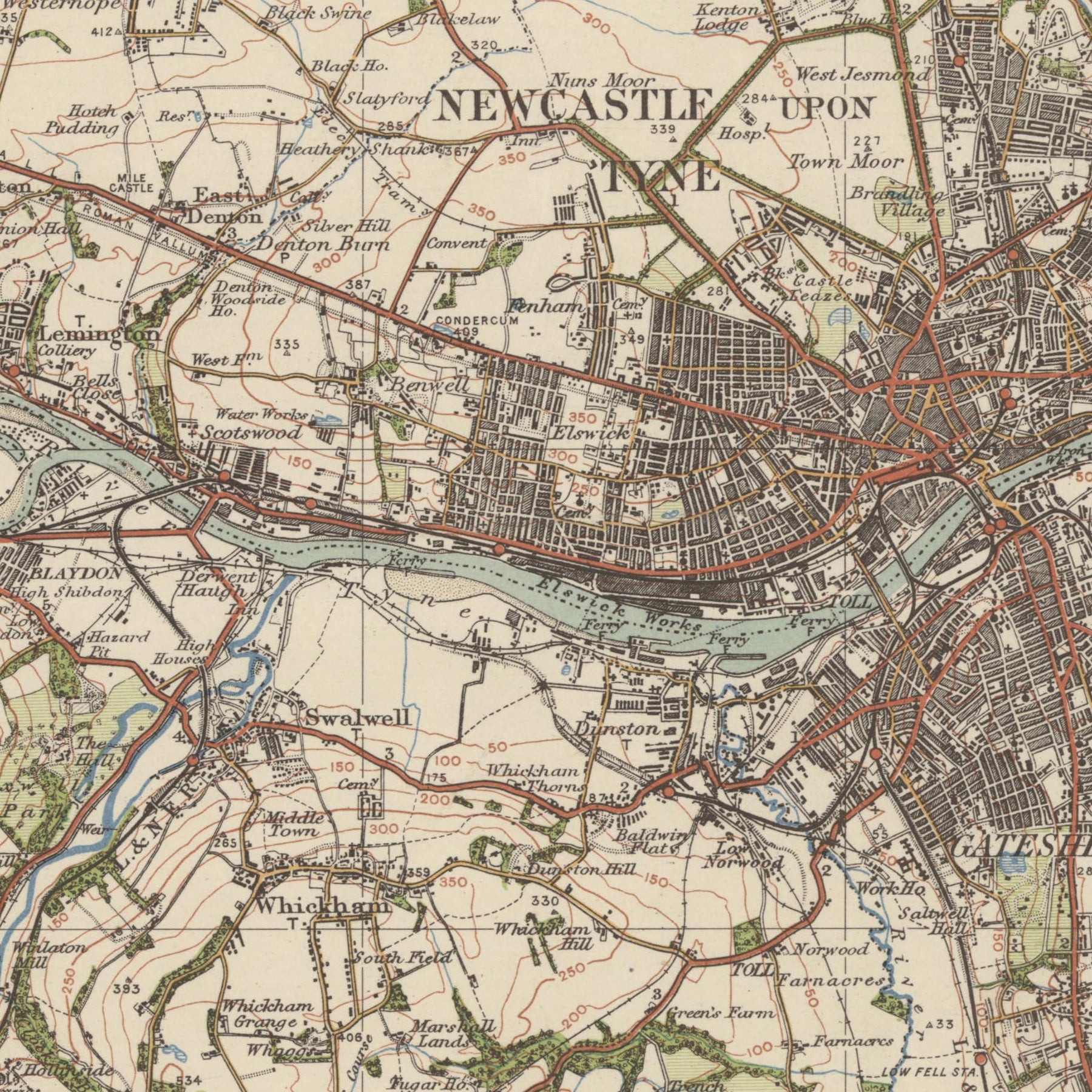 Mappa dell'Ordnance Survey Antica, Foglio 7: Newcastle Upon Tyne, 1919-1926: Gateshead, Whitley Bay, Blaydon, Cramlington, Fiume Tyne, Muro di Adriano