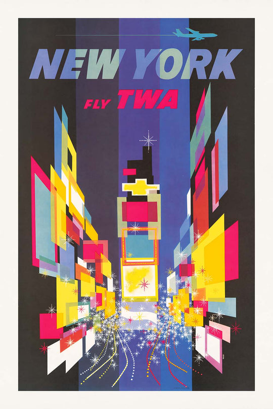 Fly TWA New York by David Klein (1960) captures the pulse of Manhattan at the height of the Jet Age. Commissioned by Trans World Airlines, the poster distills the spectacle of New York—especially the glow of Times Square—into a kinetic, modernist collage. In the artwork, a deep purple field anchors a stacked canyon of marquee-like shapes and sparkling bursts, with flashes of lemon yellow and hot pink that flicker like neon at night. The bold “Fly TWA New York” headline crowns the composition, inviting travelers into a city of light, theater, and perpetual motion.