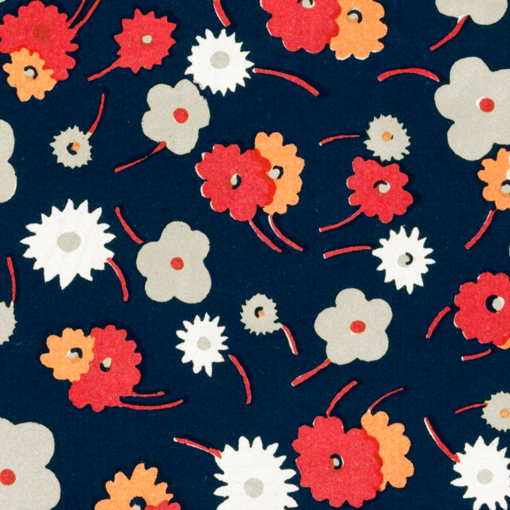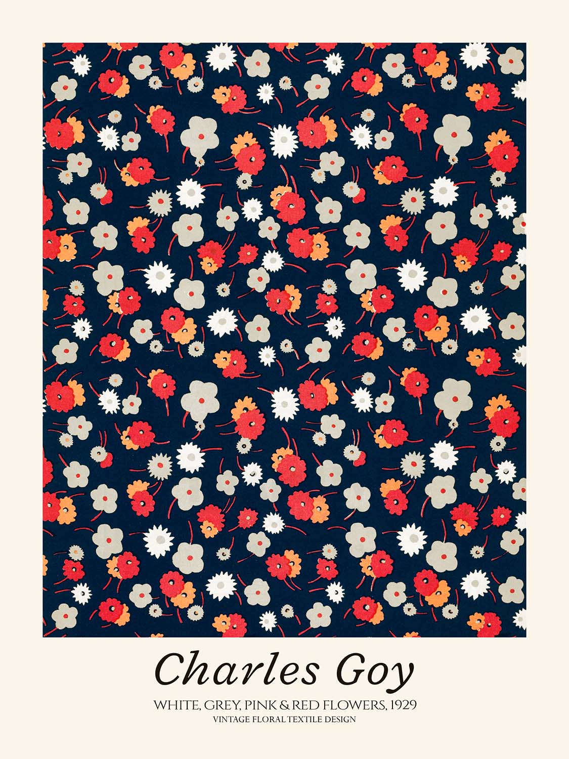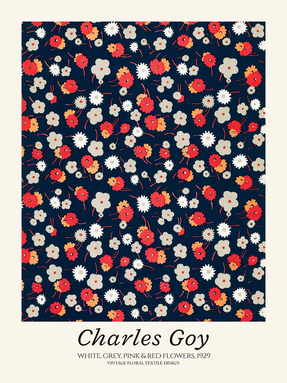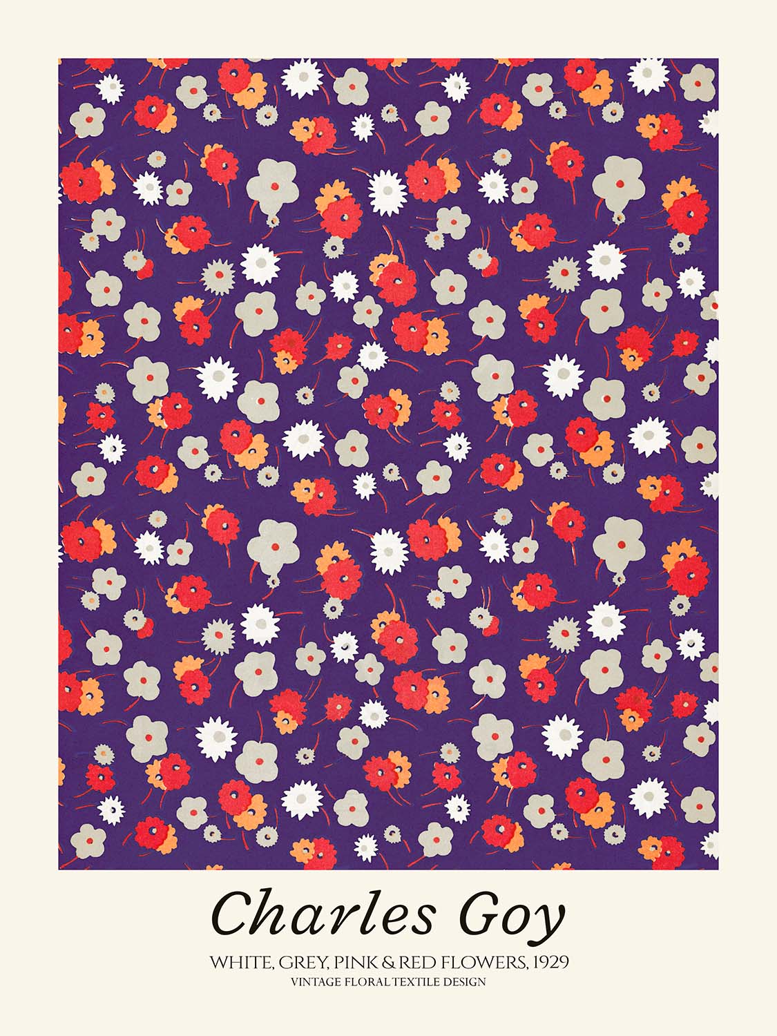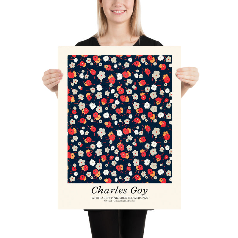 White, Grey, Pink & Red Flowers by Charles Goy (1929) is a lively interwar floral repeat that channels the elegance of Art Deco while anticipating the crisp stylisation of early Modernism. Newly restored from the original pattern, this high-quality print preserves Goy’s bold rhythm of blossoms and rounded forms, capturing the optimism and decorative flair that defined late-1920s design.