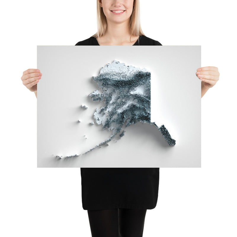 This is a minimalist topographical relief map of Alaska, created by The Unique Maps Co. and enhanced with our trademarked Unique 3D process. There are no labels, no roads, and no towns — only the sculpted forms of the land itself. Carefully modeled light and shadow sweep across the surface to pick out razor-edged ridgelines, deep glacial troughs, and the broad, quieter expanses of lowland plains.