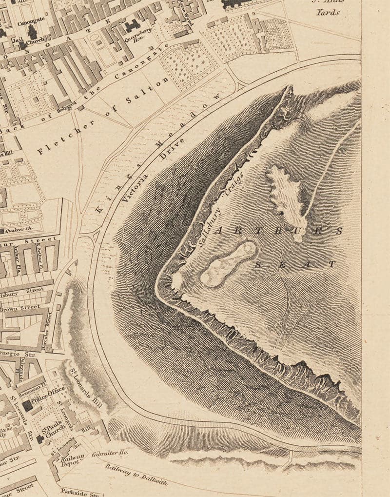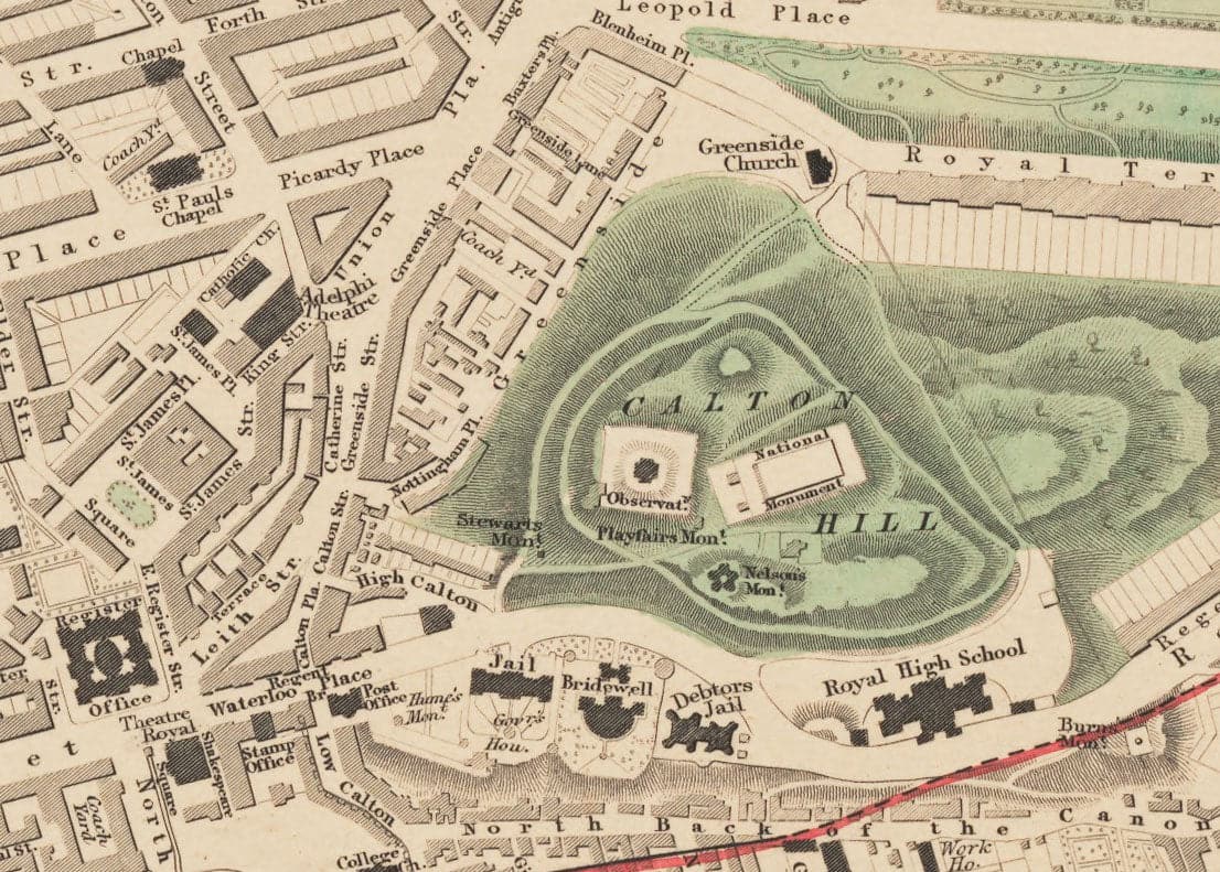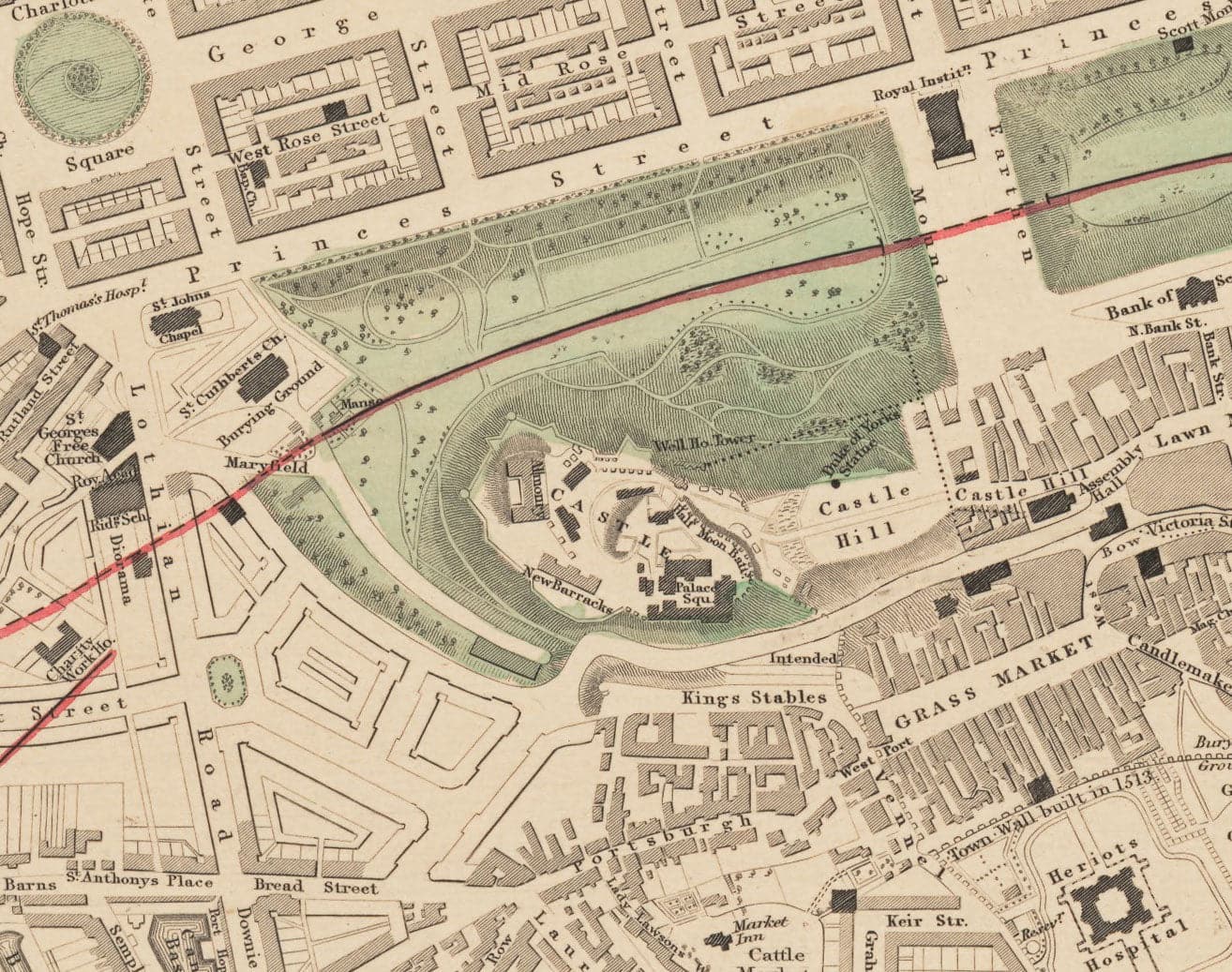 Come molte città antiche, puoi vedere che il centro di Edimburgo non è cambiato fondamentalmente da almeno 150 anni! L'area centrale di Queen Street, George Street e Princes Street è già stata tracciata. Ovviamente Calton Hill e Arthur's Seat non si sono mossi.