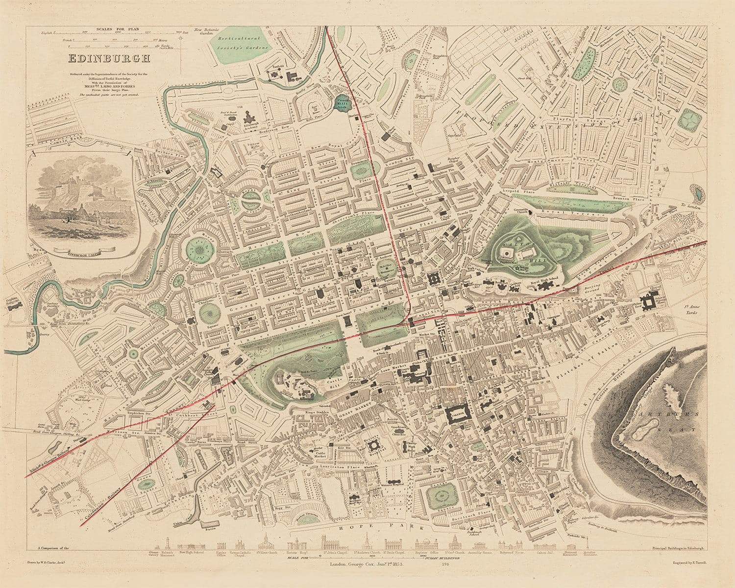 Il Water of Leith è colorato di un bel blu e si snoda lungo il lato sinistro della mappa. Un'incisione altamente dettagliata del Castello di Edimburgo è inserita a sinistra.
