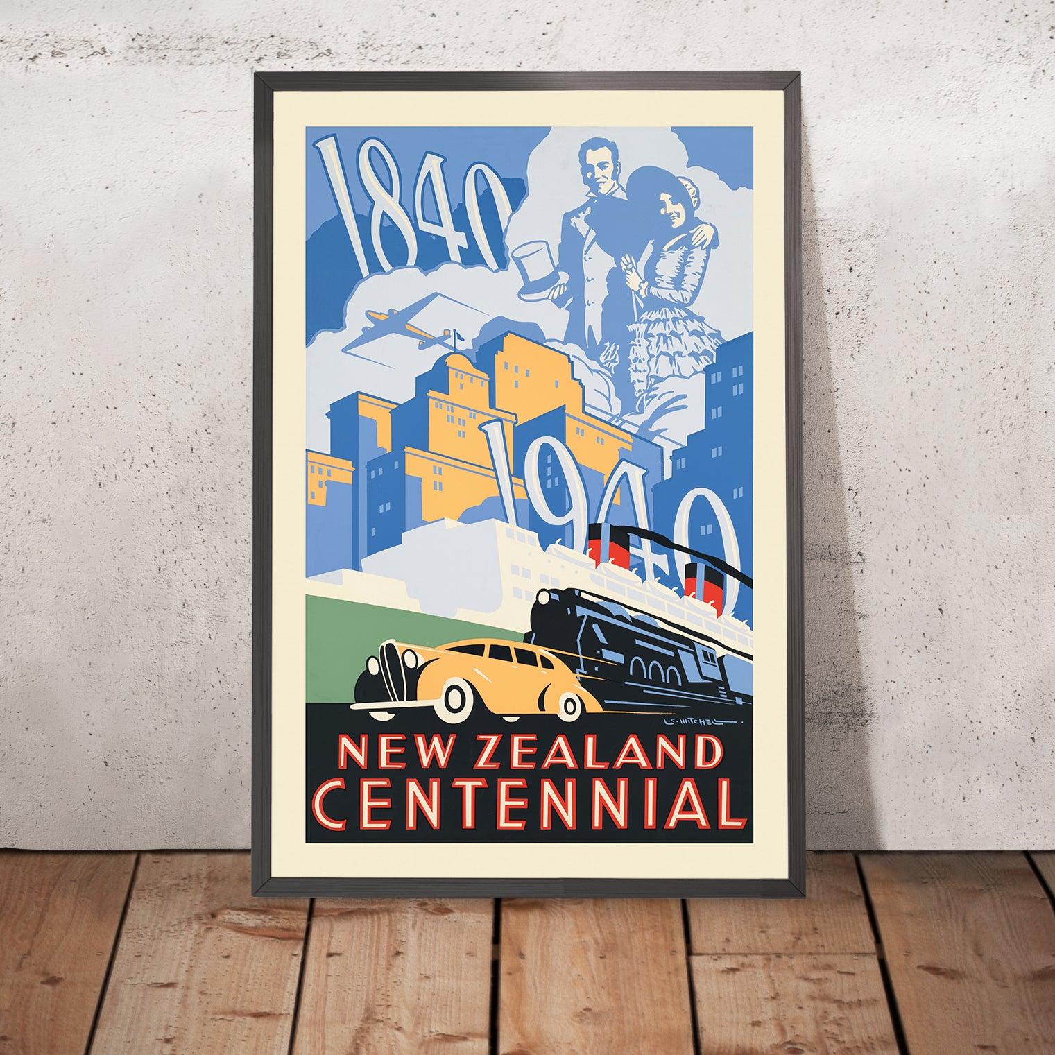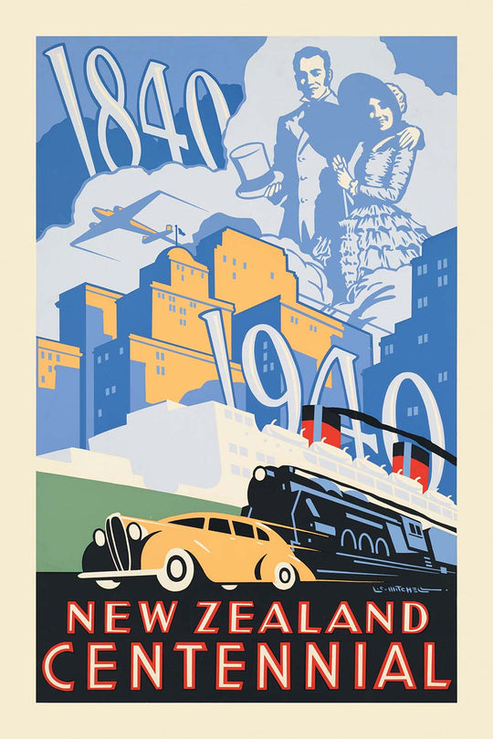 New Zealand Centennial by Leonard Cornwall Mitchell (1940) captures a proud moment in Aotearoa New Zealand’s story: one hundred years since 1840, evoked through a confident, modern graphic language. Designed at the height of mid-century poster art, it blends Art Deco sleekness with a spirit of national optimism. Mitchell contrasts the dates “1840” and “1940” and sets early settler figures against symbols of rapid progress—an airplane, a steam train, and a motorcar—so the viewer feels a century’s leap in a single glance. Cool oceanic blues meet warm sunrise yellows and soft oranges, while strong black accents and geometric forms give the piece striking clarity at a distance—exactly what great travel posters were made to achieve.