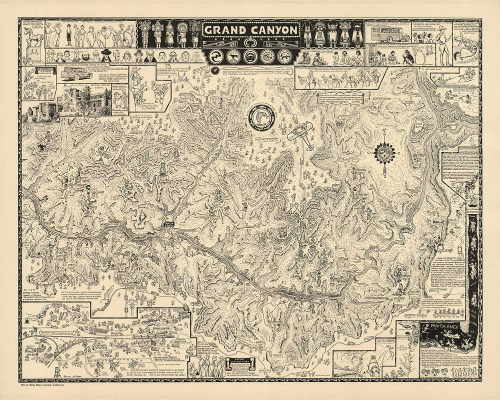 Mappa illustrativa antica del Grand Canyon nel 1931 di Jo Mora: Arizona, fiume Colorado, Horseshoe Bend, nativi americani