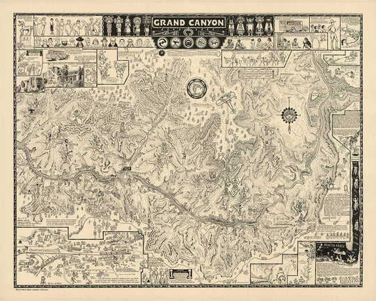 Ci sono molte illustrazioni dei nativi americani, fatti storici e altri luoghi attorno alla mappa che evidenziano perché il Grand Canyon rimane una delle principali attrazioni turistiche del mondo.