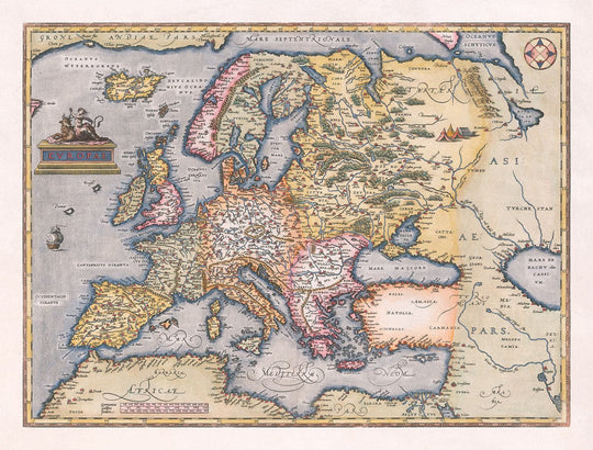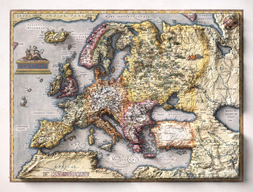 Questo è un esempio molto fine della prima mappa dell'atlas d'Europa, pubblicata per la prima volta dal cartografo olandese Abraham Ortelius nel 1570. Questa mappa è stata originariamente colorata a mano quasi esattamente 450 anni fa ed è stata amorevolmente restaurata da The Unique Maps Co.