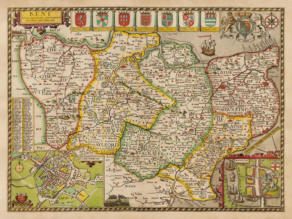 Mappa antica del Kent nel 1611 di John Speed: Dartford, Maidstone, Bromley, Tunbridge, Gillingham, Chatham