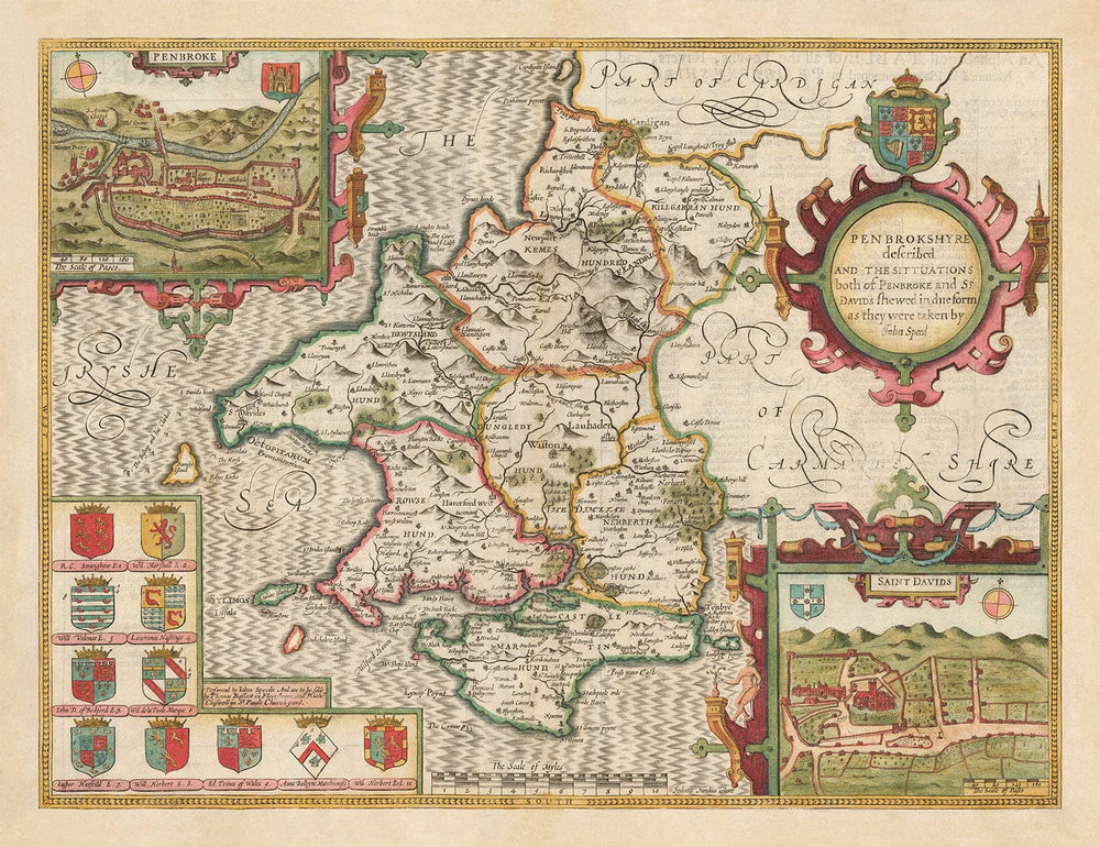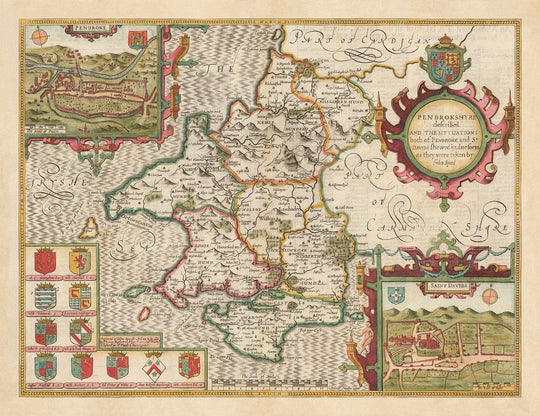In alto a sinistra c'è una bella incisione dettagliata di Pembroke, la città - e in basso a destra, St Davids, la città più piccola del Regno Unito.