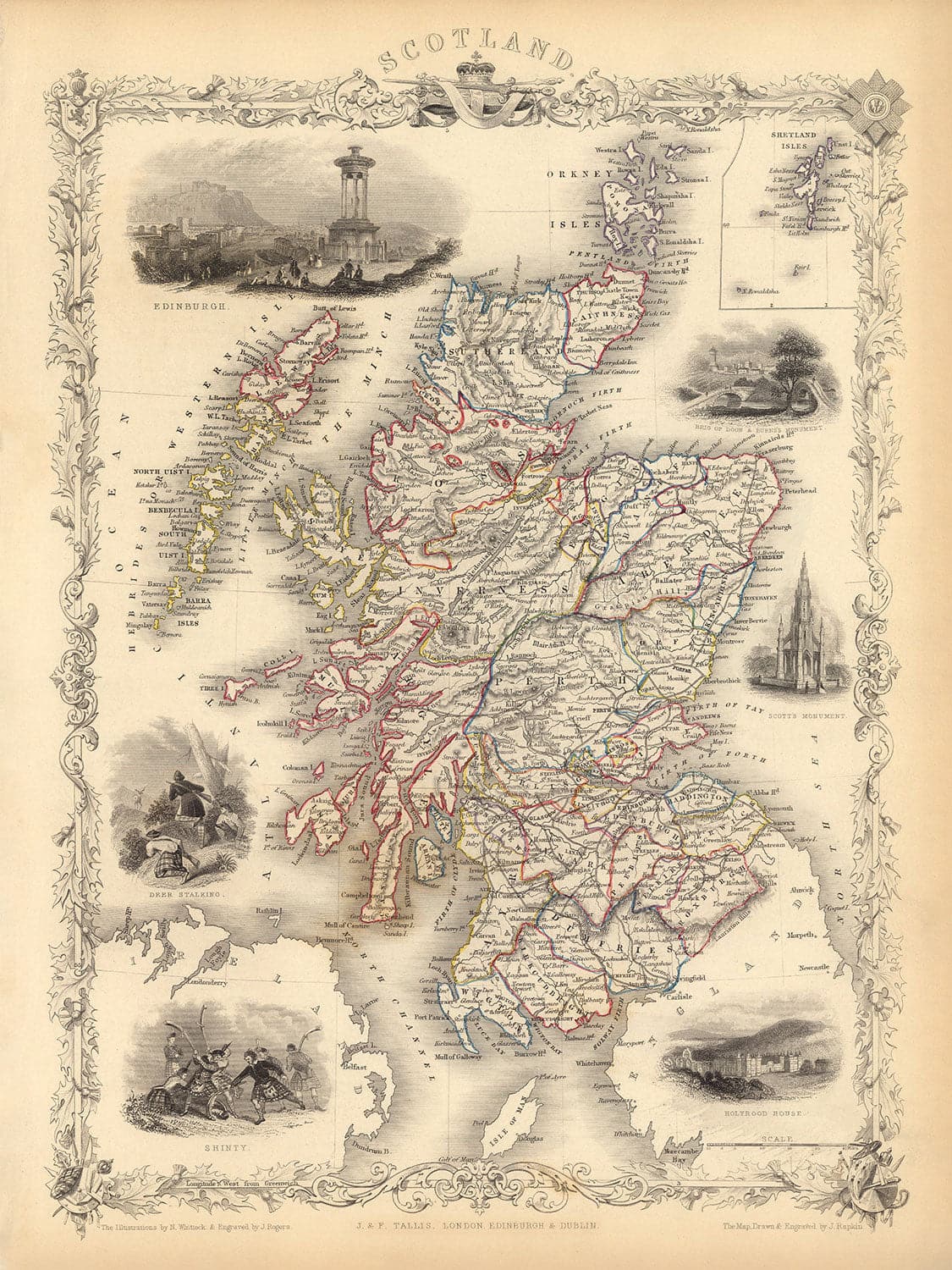 Questa è una mappa antica altamente decorativa della Scozia, pubblicata da John Tallis nel 1851, uno dei migliori cartografi dell'epoca. Tutta la Scozia è visibile qui, comprese le Isole Shetland, le Isole Orcadi e l'arcipelago delle Ebridi. Bellissime incisioni adornano i bordi della mappa, inclusa una vista di Edimburgo, la caccia al cervo, il Monumento a Scott e il Brig O' Doon e il Monumento a Burns.