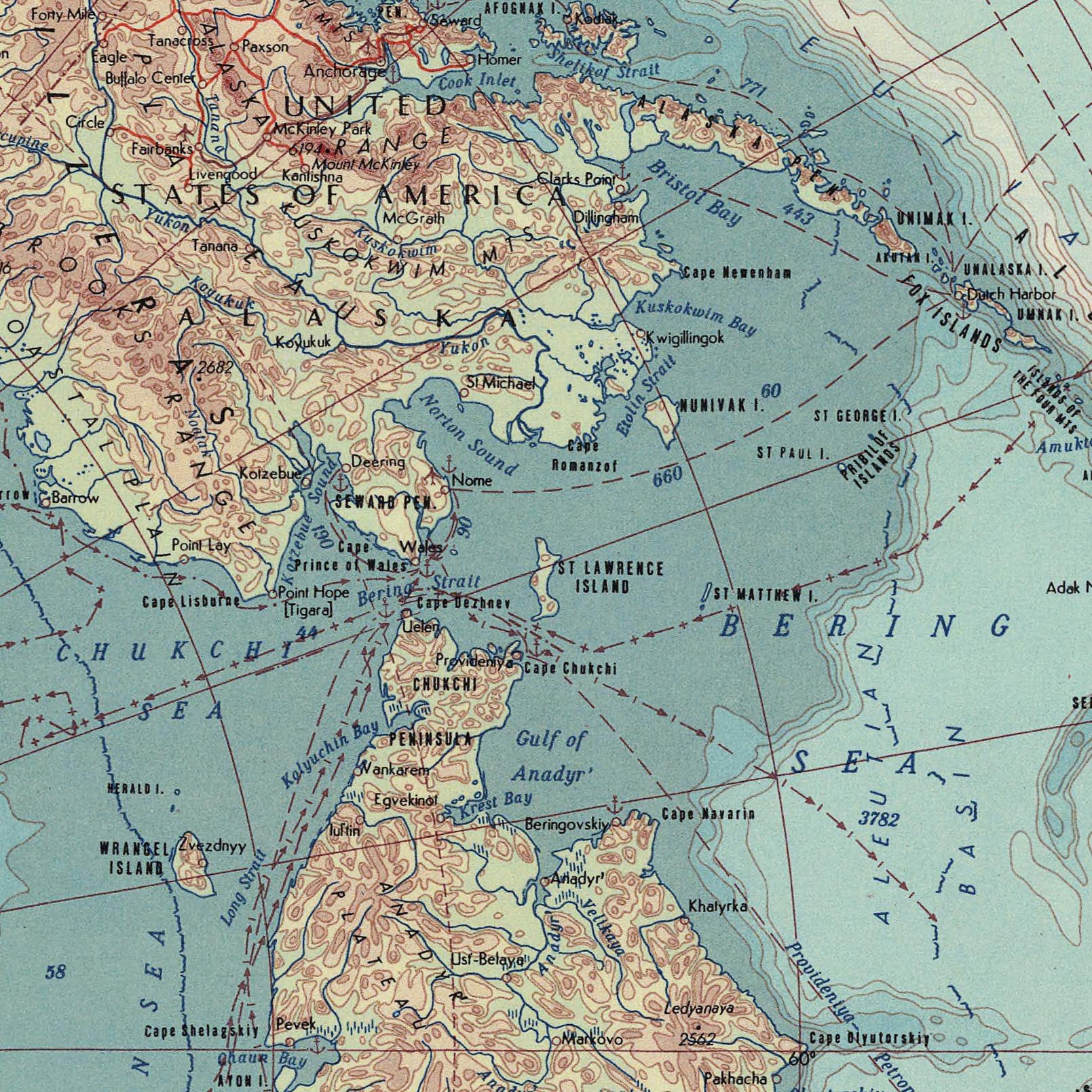Questa mappa non è semplicemente una rappresentazione geografica, ma anche un documento storico che illustra i percorsi delle spedizioni scientifiche precedenti al 1957. I percorsi incisi sulla mappa sono testimoni silenziosi dello spirito di esplorazione e scoperta che ha caratterizzato l'epoca. L'inclusione di dati batimetrici e topografici aggiunge un ulteriore strato di ricchezza alla mappa, fornendo intuizioni sulle caratteristiche fisiche della regione artica. Lo spettatore può tracciare i contorni del fondale oceanico nell'Oceano Artico e nel Mare di Bering, e visualizzare il terreno accidentato del Canada settentrionale, della Russia settentrionale e della Groenlandia.