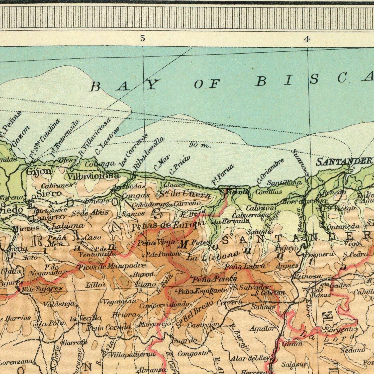 John George Bartholomew—often styled the “Prince of Cartography”—brought to this sheet the house virtues of clarity, color, and synthesis. Under the imprint of the Edinburgh Geographical Institute, his team perfected hypsometric tints that communicate altitude intuitively, paired with spot heights for precision and bathymetric hues for the sea’s architecture. The Times atlas setting ensured rigorous editorial review and timely corrections, reflecting fresh triangulations, improved coastal surveys, and standardized place-names across Spanish and Portuguese usage. Supplanting Andree’s nineteenth-century plates, this 1922 issue stands at the hinge of eras: scientifically modern, visually humane, and alert to a geopolitics in which borders, ports, and routes mattered as never before.