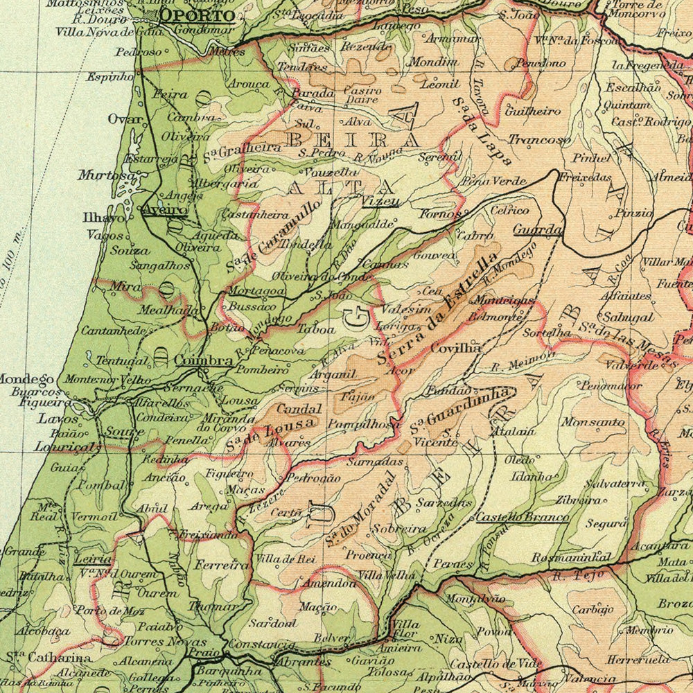 The physical story of western Iberia is told through relief that rises from the ocean’s edge into serried ramparts and high plateaux. In Portugal, the Serra da Estrela crowns the interior, while the Tejo (Tagus), Douro, Minho, and Guadiana rivers carve decisive corridors from the uplands to the Atlantic. Eastward, the Sistema Central and the Sierra Morena articulate Spain’s backbone and southern threshold, steering waters toward the Duero and Guadalquivir basins. Along the Algarve and the Gulf of Cádiz, bathymetric tints trace the continental shelf and approaches to anchorage, the palette deepening over submarine valleys and gentle banks. Promontories—Cabo da Roca and Cabo de São Vicente—punctuate the coastline, the latter a perennial waypoint at Europe’s southwest corner.