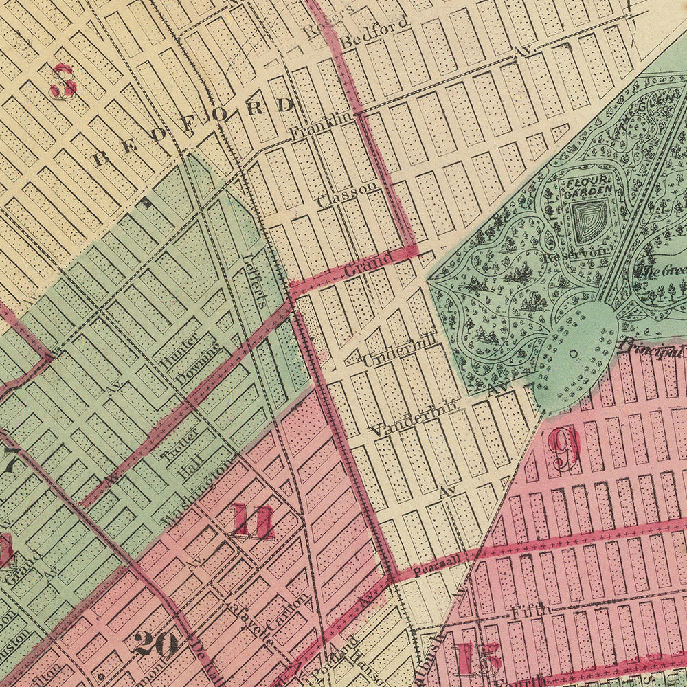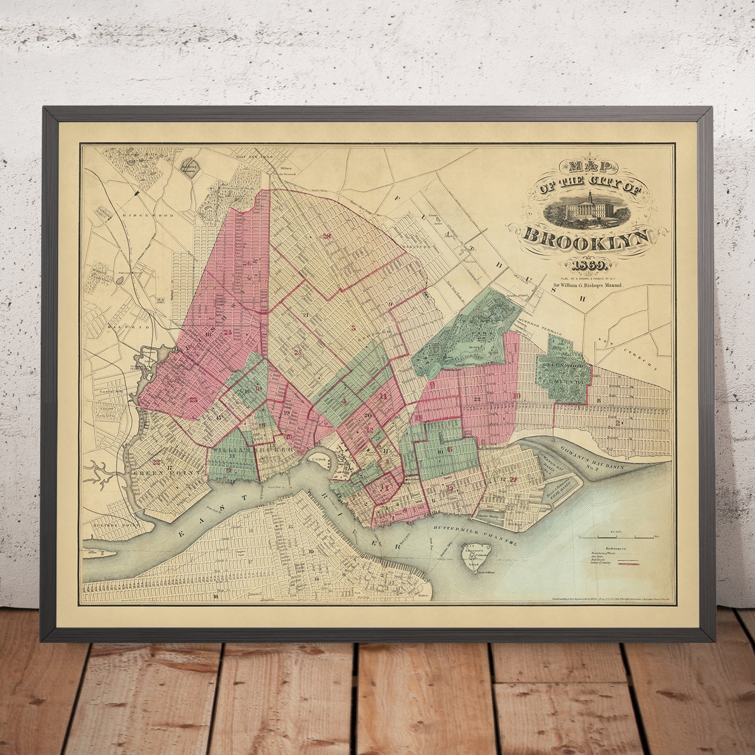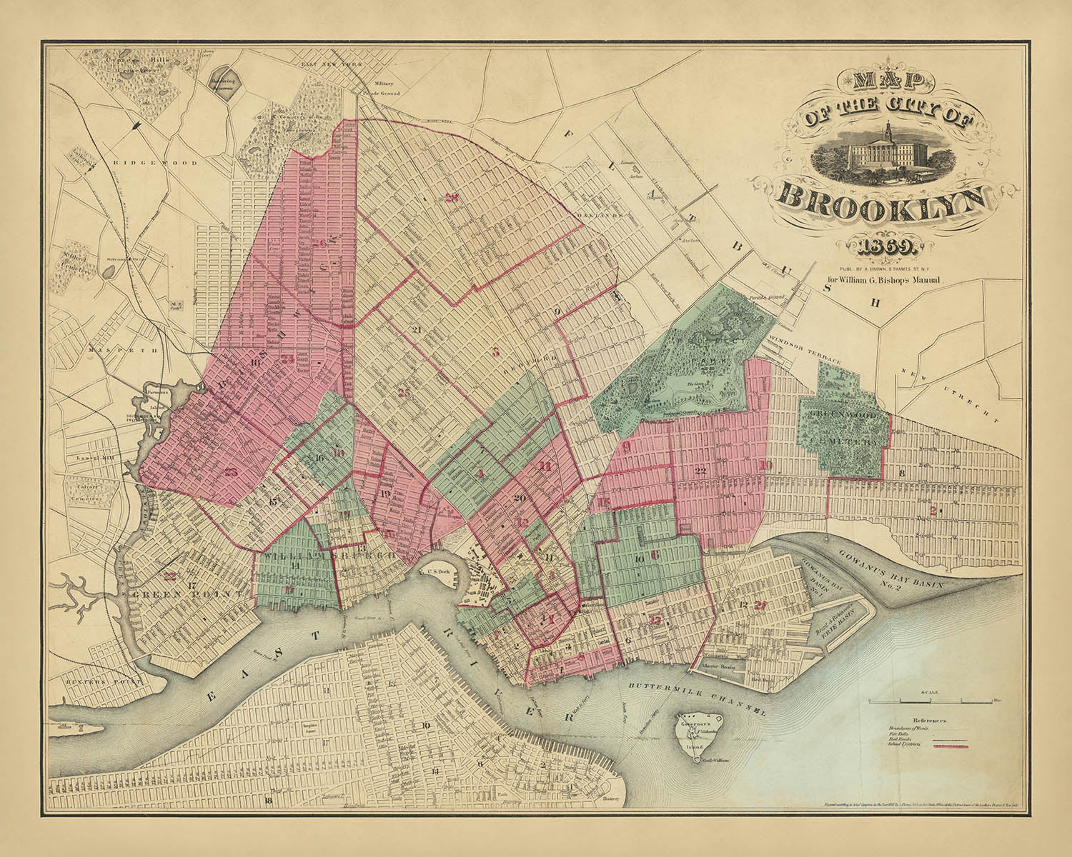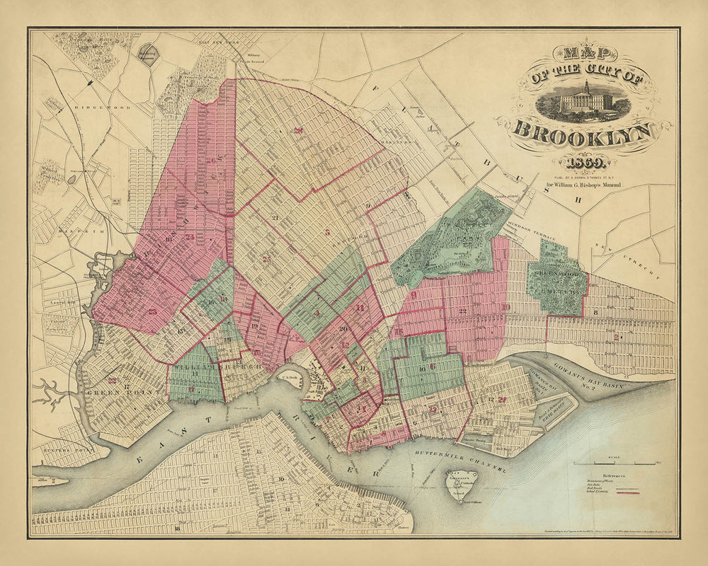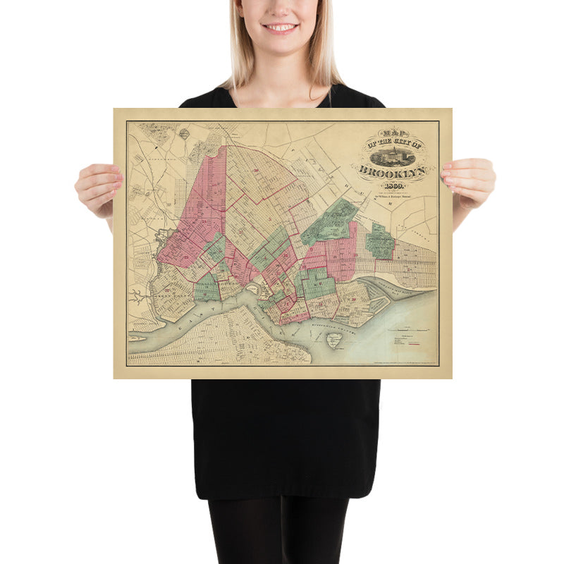 Map of the Consolidated City of Brooklyn 1869, issued by A. Brown & Co., captures the borough at the precise moment its stitched-together villages—Brooklyn, Williamsburgh, and Bushwick—had settled into a single urban organism. Drawn from the vantage of the East River waterfront inward, the plan documents a city surging with steam ferries, rail corridors, and newly formalized civic spaces, all keyed to the 1855 consolidation that transformed Kings County’s patchwork into a metropolis. The city map is notable for the way it balances ornament and exactitude: a crisp grid radiates from Fulton Street and Court Street while the waterfront’s ferries knit Brooklyn to Manhattan, underscoring how mobility and municipal ambition shaped the streets and neighborhoods that would define modern Brooklyn.