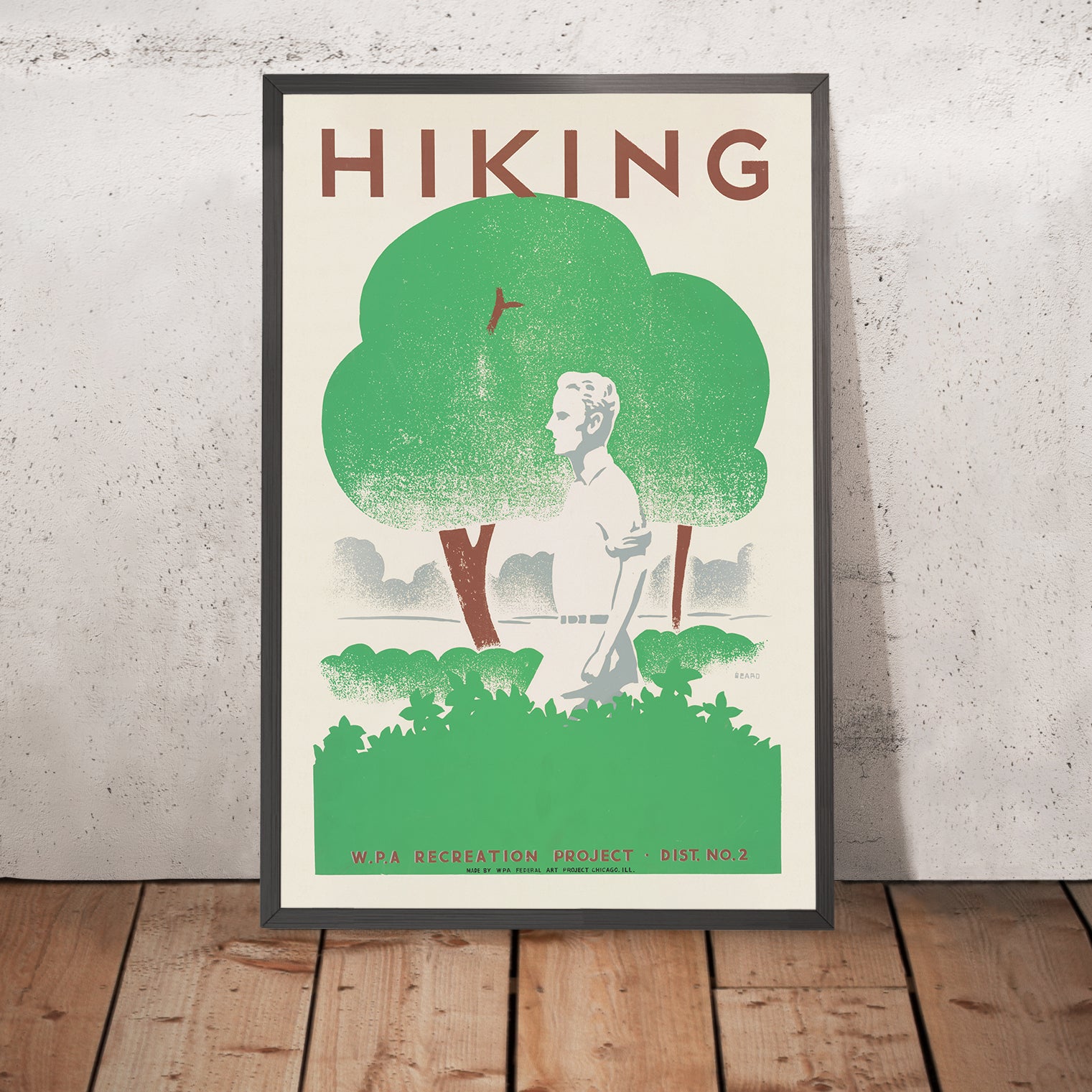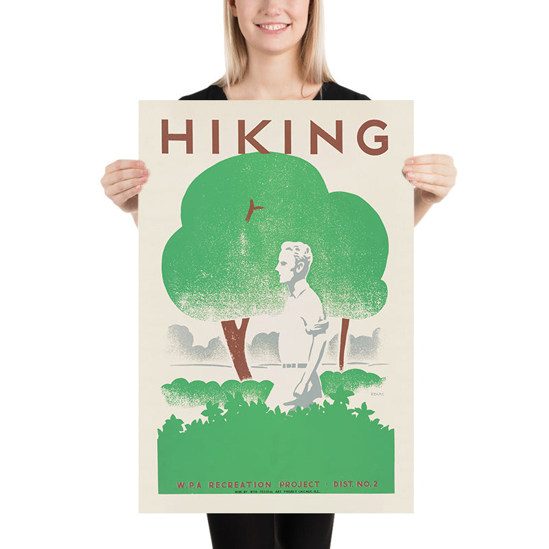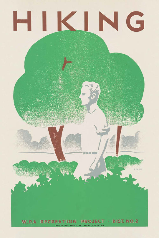 Hiking (1939) by the graphic artist Beard captures the clean lines and optimism of mid-century American poster art at the height of the Works Progress Administration era. With its pared-back forms, bold lettering, and nature-first message, the design speaks to the late-1930s cultural push to get citizens into the fresh air—onto trails, into forests, and out exploring public lands.