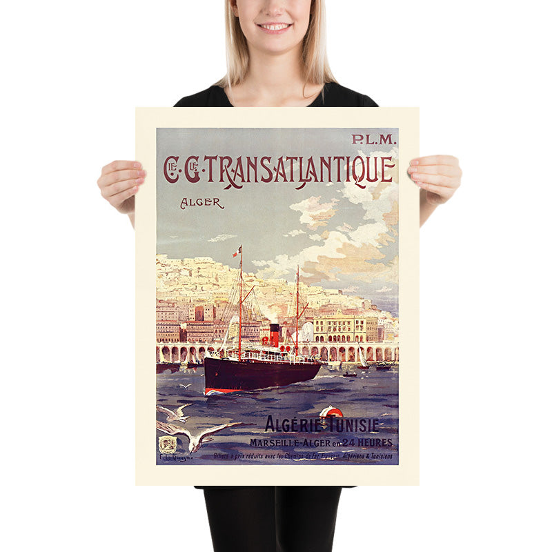 Cie. Gle Transatlantique, Alger by Fernand Le Quesne (1901) is a luminous Belle Époque travel poster inviting the viewer across the Mediterranean to Algiers. Created for the Compagnie Générale Transatlantique in collaboration with the P.L.M. railway, the design celebrates the speed and romance of turn‑of‑the‑century travel. In the image, a black‑hulled liner with a single red funnel glides into a deep blue harbor, gulls skimming the whitecaps in the foreground while Algiers rises behind in sun‑bleached tiers and graceful seaside arcades. The poster’s hand‑lettered notes “Algérie Tunisie” and “Marseille–Alger en 24 Heures” evoke the era’s streamlined connections between France and North Africa.