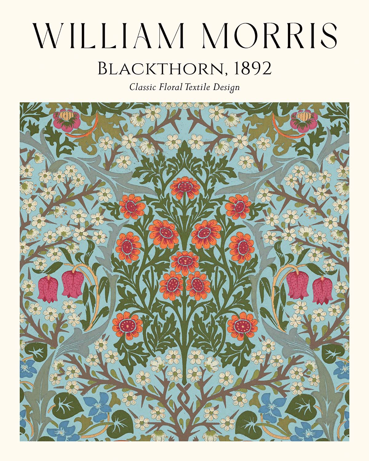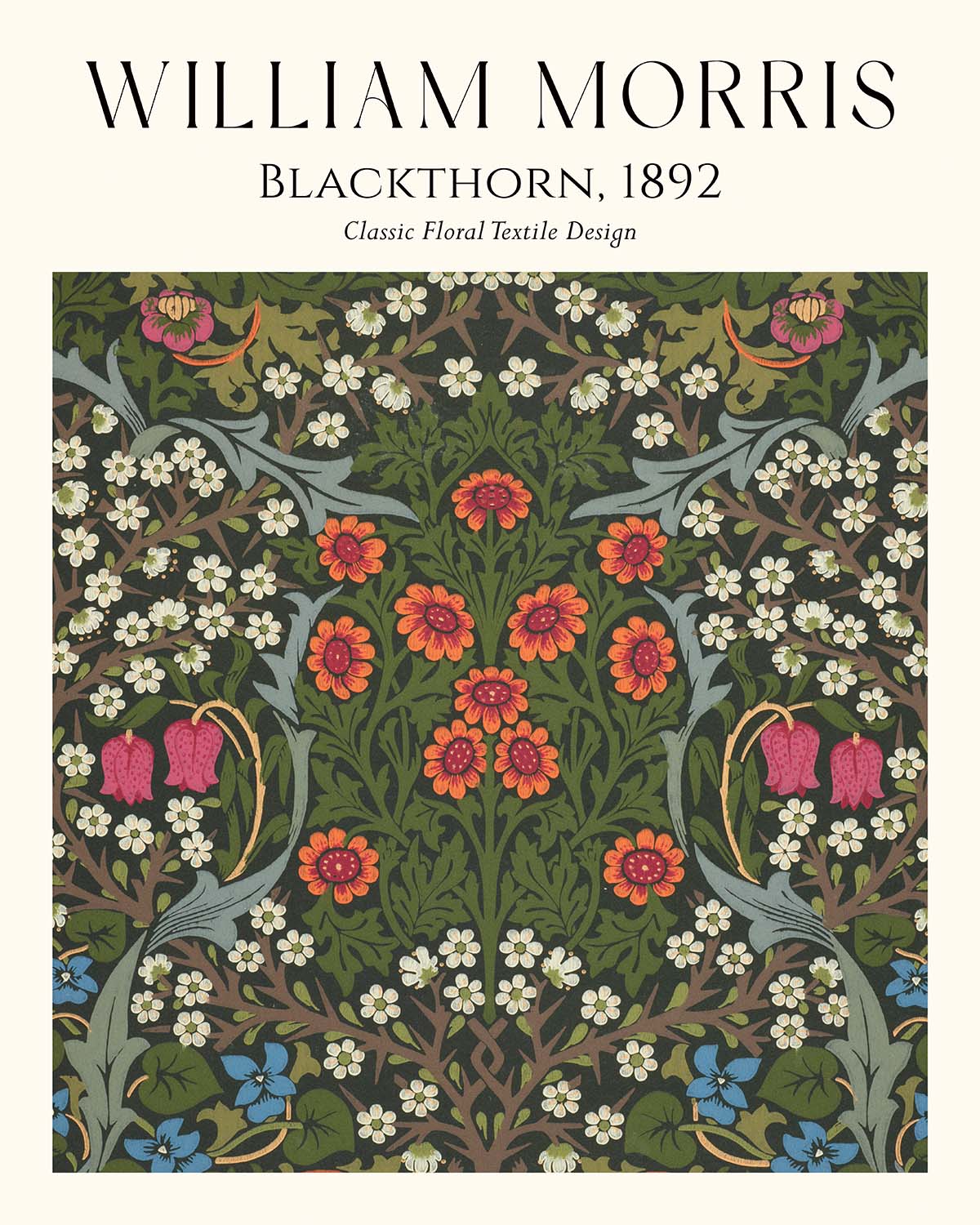 William Morris’s Blackthorn (1892) is presented here as a lovingly restored, high-quality print of the original Arts & Crafts design. Conceived during the height of Morris’s influence, this pattern was most likely rendered as a wallpaper, though it may also have been adapted for carpets, curtains, or other textiles. The design distills the movement’s devotion to nature, pattern, and handcraft into a rhythmic composition of blossoms, leaves, and thorny stems—an enduring emblem of domestic beauty and artisanal integrity.