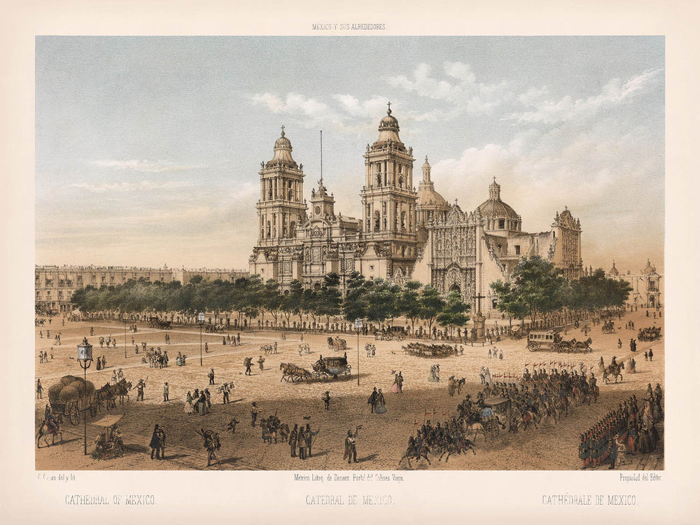 This particular view of the Mexico City Cathedral stands out as a landmark image for its combination of artistry and documentation. Presented with running titles in both English and French, and backed by a meticulously researched context, the lithograph embodies the multicultural sophistication of the time. It shines as a vivid testament to the architectural splendor and societal complexity of Mexico’s capital, gathering within its wide canvas details of urban life, ceremonial structures, and the everyday presence of people identified at the time as “Mexican Indians”.
