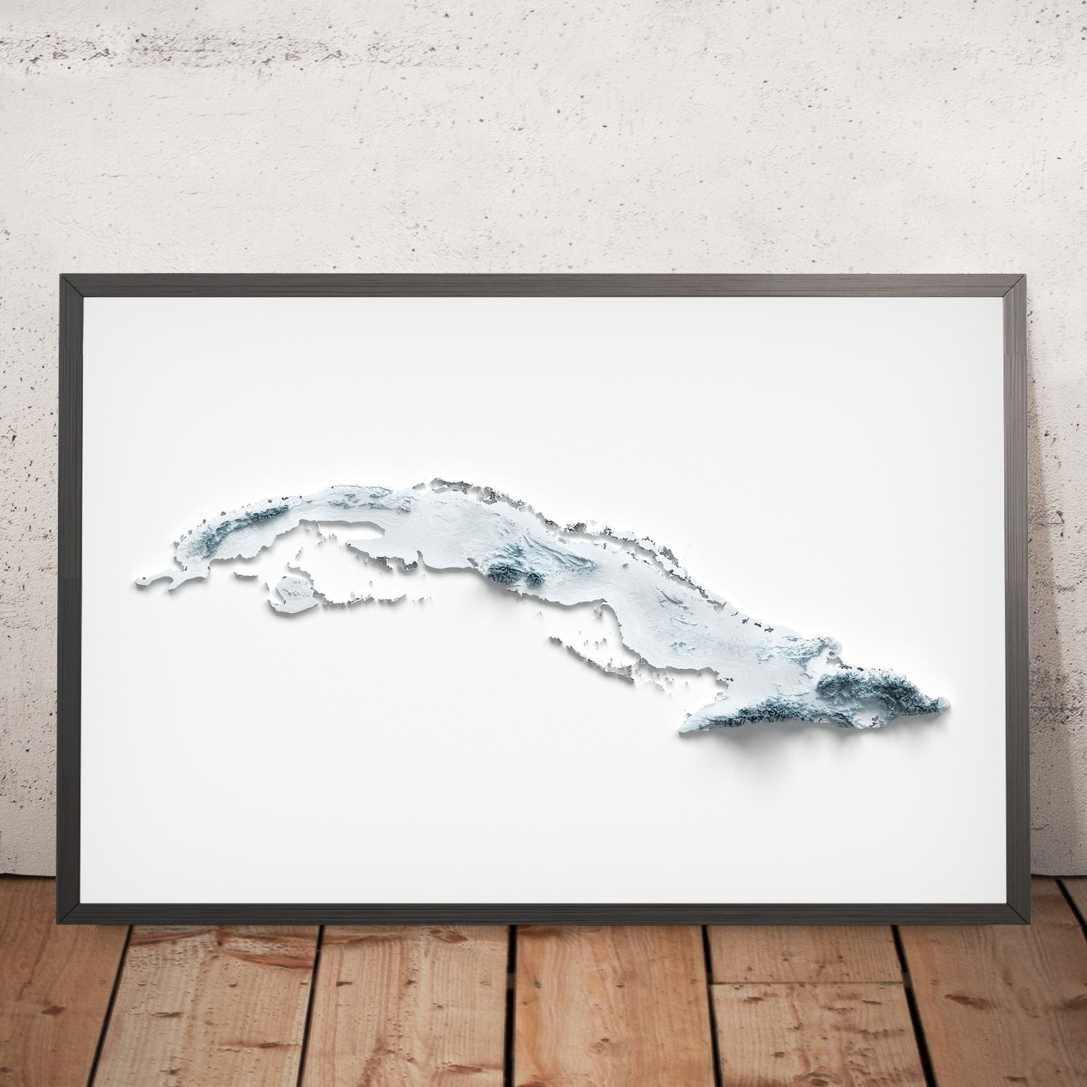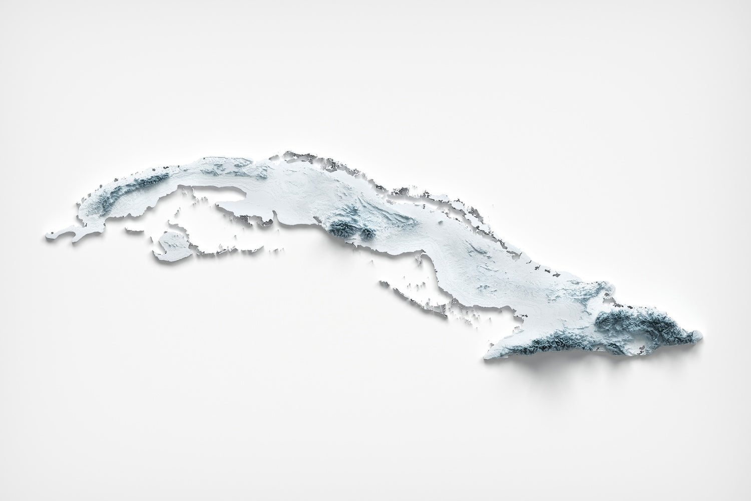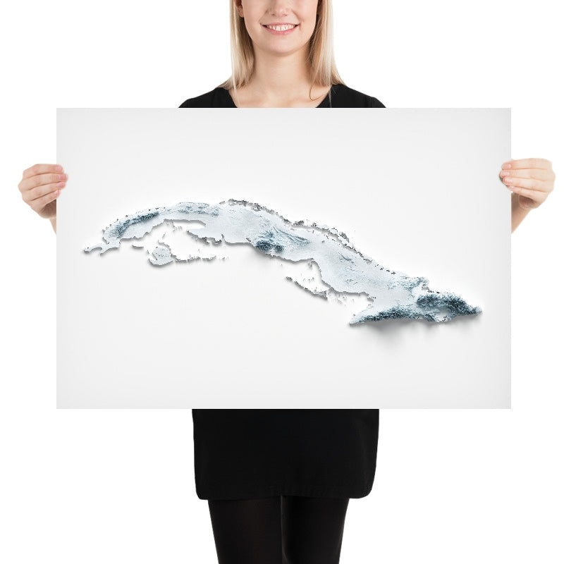 This is a minimalist topographical relief map of Cuba, created by The Unique Maps Co. and enhanced with our trademarked Unique 3D process. There are no labels, no roads, and no towns—just form, where light and shadow pick out the island’s spine of mountains, wide plains, and serrated coastlines. With a single glance you can trace Cuba’s geological story, from steep maritime ranges to broad interior basins and long shelves that ease toward the sea.