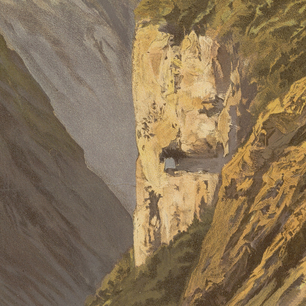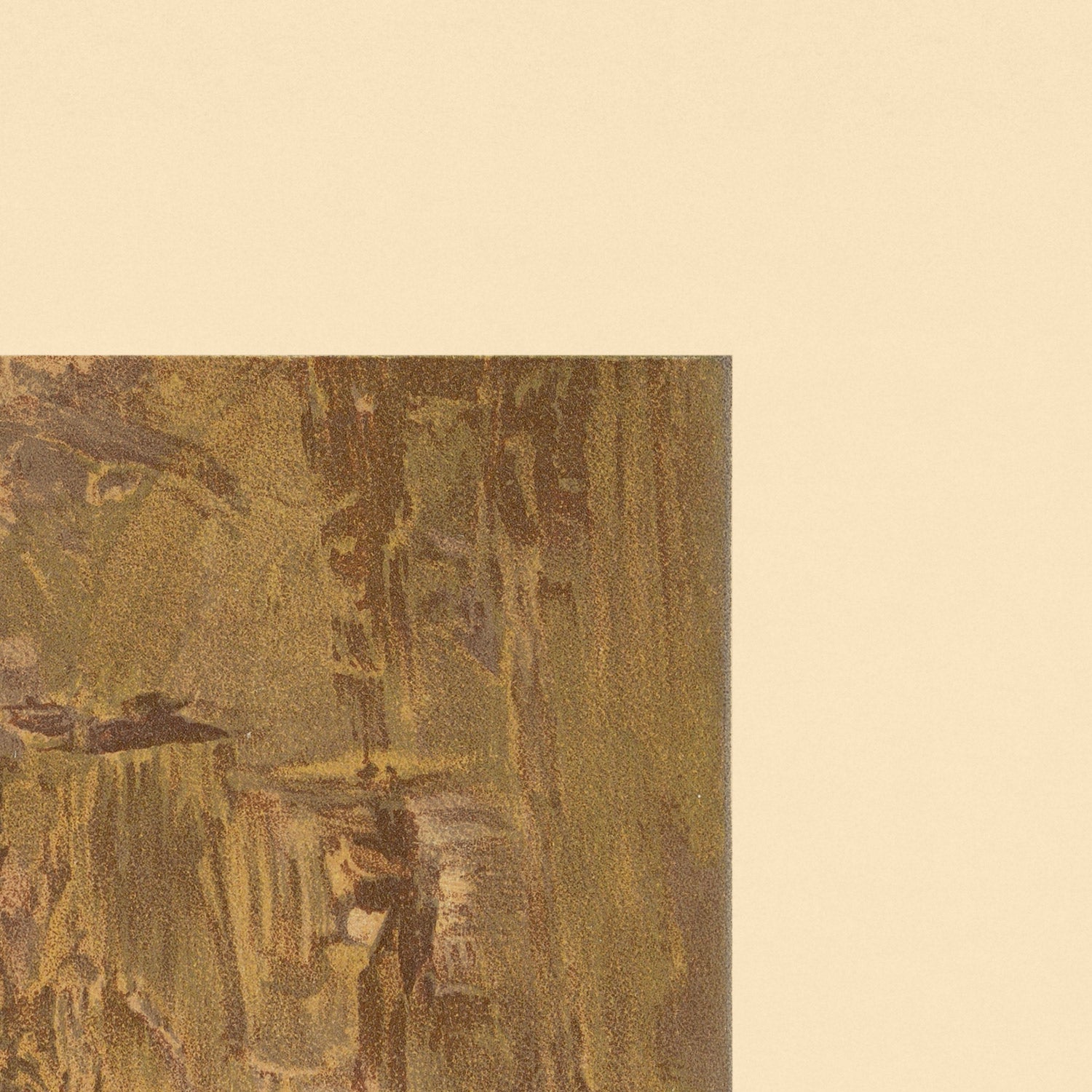 D’Alési’s palette of soft greens, warm earth tones, and gentle beige highlights evokes the region’s vegetation and rock, while muted blues lend the river a cool, tranquil depth. Jagged escarpments are articulated with textured strokes that suggest weathered stone, contrasted by the smooth curves of the river below. An inset vignette of local architecture underscores the region’s cultural charm, and period typography grounds the composition in its 1890s heritage. The result is a harmonious fusion of Romantic natural grandeur and elegant graphic design—ideal for anyone seeking a statement piece that conveys both wanderlust and history.