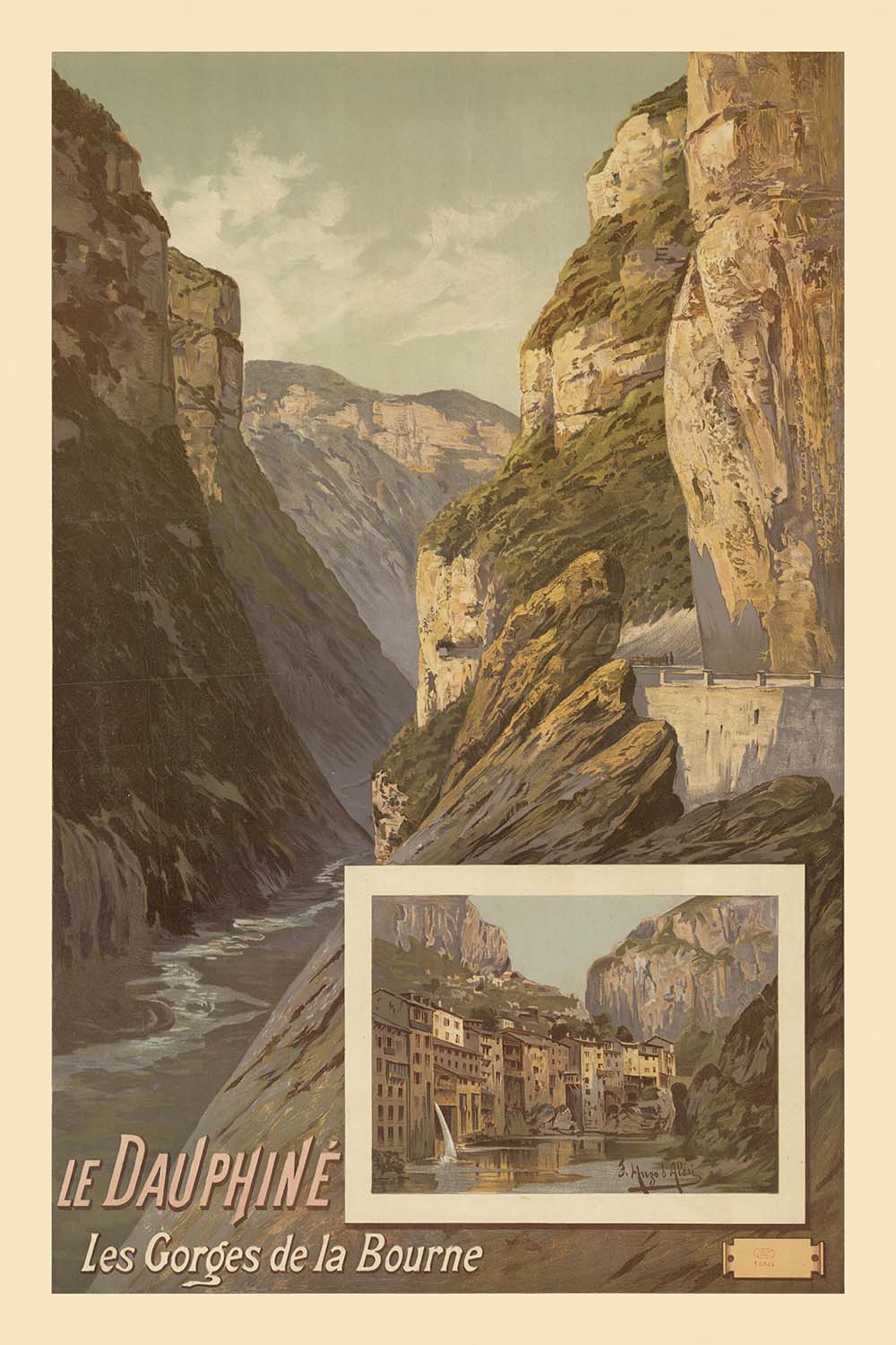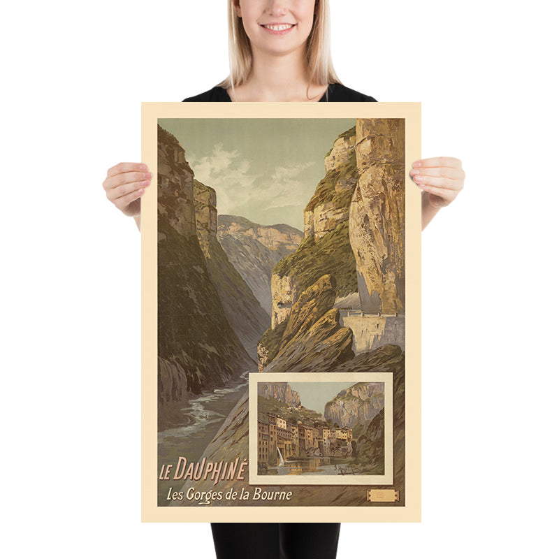 The Gorges de la Bourne sit in historic Dauphiné (today within Isère), where the Bourne River slices through the limestone ramparts of the Vercors. By the late 1800s, improved roads and rail lines opened this once-remote country to travelers, who came for the sheer spectacle: high, stratified cliffs, forested slopes, and a sinuous waterway coursing beneath dramatic overhangs. This poster distills that allure, functioning both as an invitation to explore the French Prealps and as a visual time capsule from the golden age of travel.