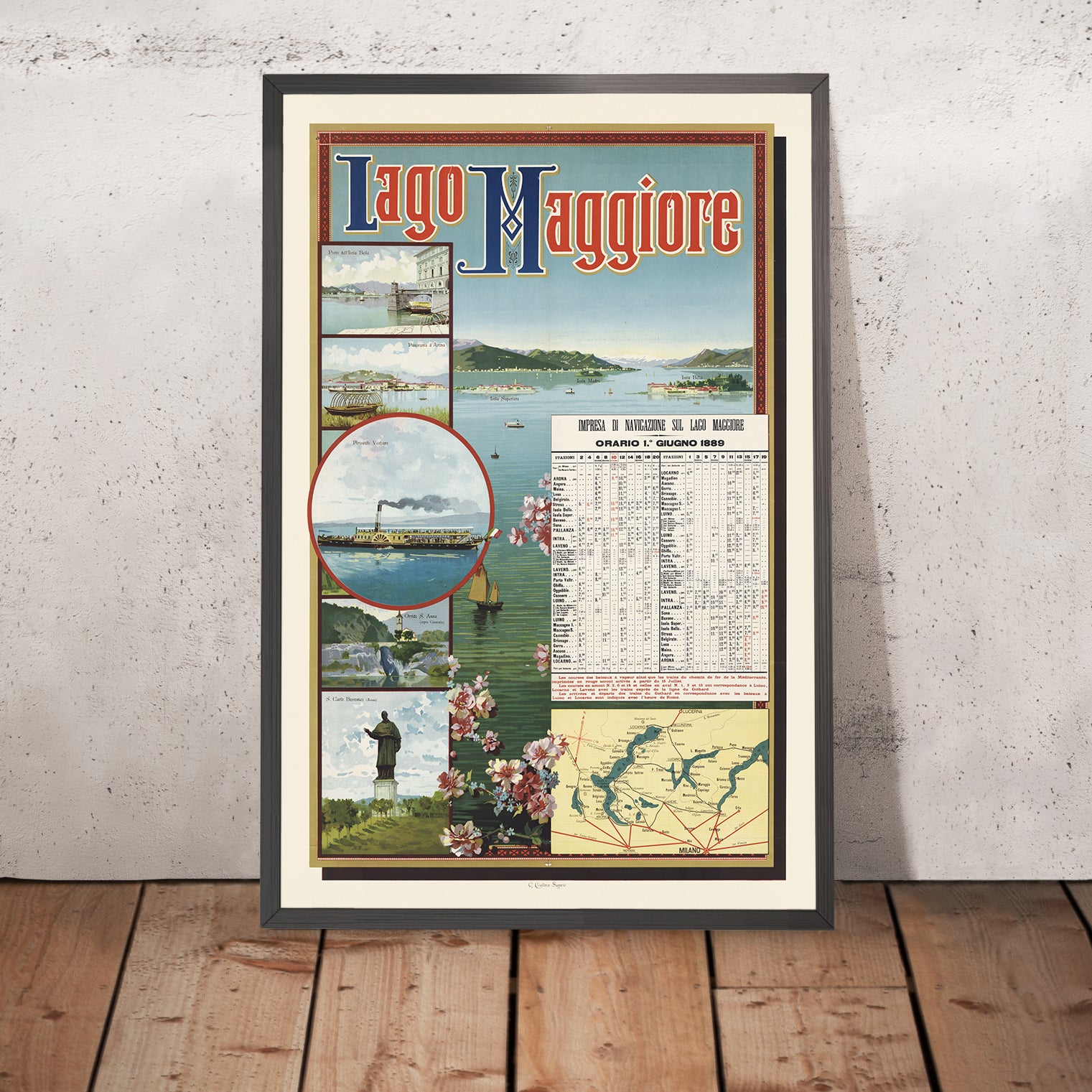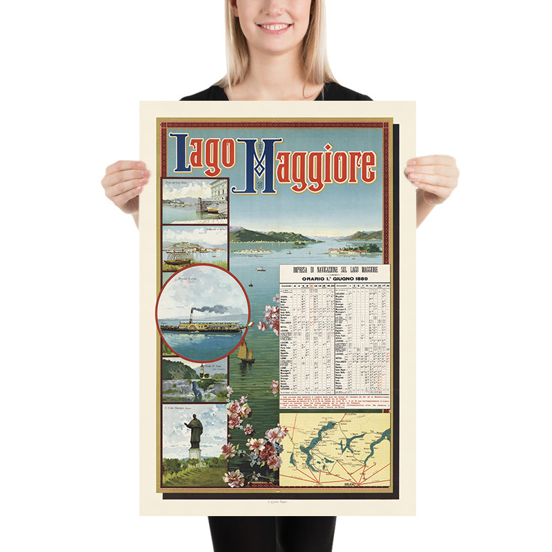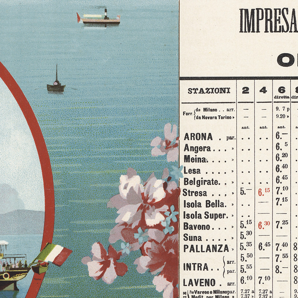 Why this subject matters: The poster presents Lake Maggiore at a transformative moment when steam-powered navigation knit together lakeside towns and grand villas, making the region newly accessible to visitors. Timetables like this were both elegant advertisements and essential travel tools, symbolizing the spirit of progress and the romance of continental touring. Displaying a steamboat within a framed vignette, the design nods to innovation while celebrating the timeless allure of the lake.