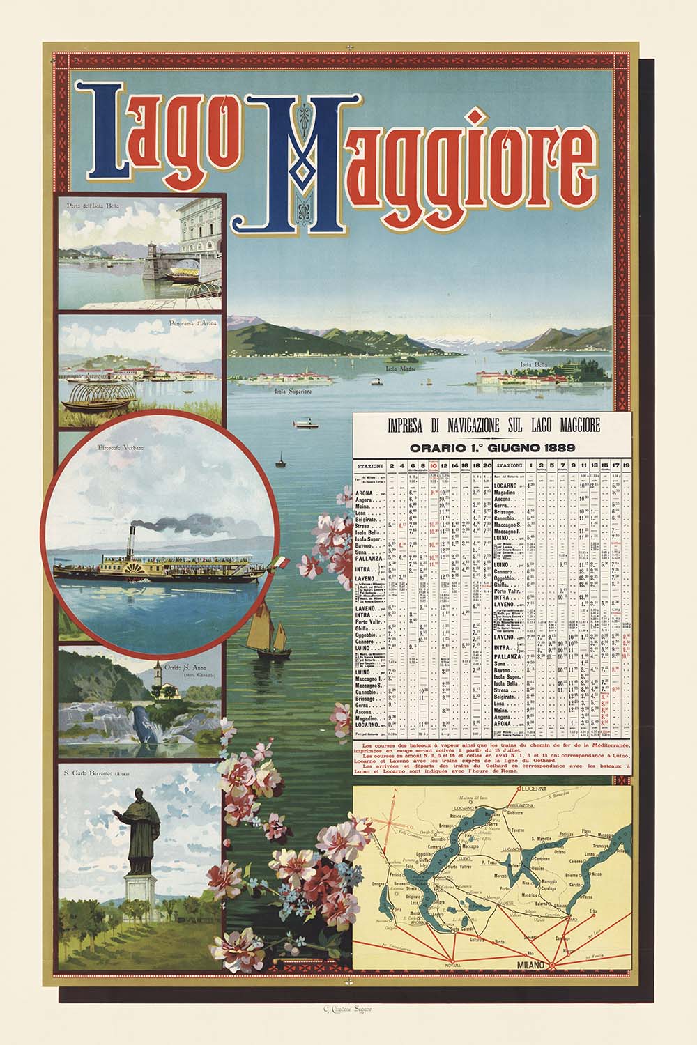 Lago Maggiore. Impresa di Navigazione sul Lago Maggiore. Orario 1. Giugno 1889 by Gabriele Chiattone is a luminous late-19th-century travel poster celebrating one of Europe’s most enchanting lakes. Issued at the height of the continent’s leisure boom, it advertises the June 1, 1889 steamboat timetable and captures the beauty and sophistication of the Italian-Swiss lake district. Lake Maggiore stretches across northern Italy into Switzerland’s Ticino, ringed by alpine foothills, grand hotels, and garden-studded shores—exactly the kind of picturesque scenery that drew travelers during the Belle Époque.