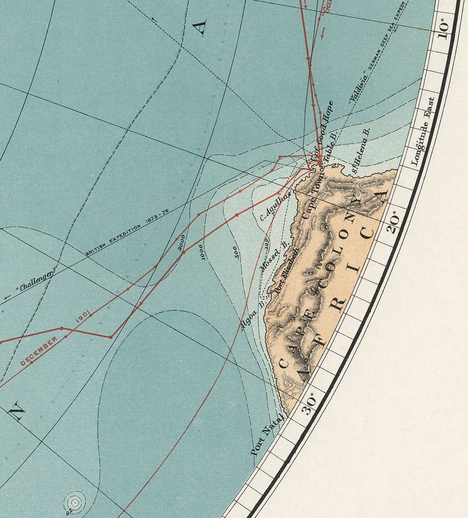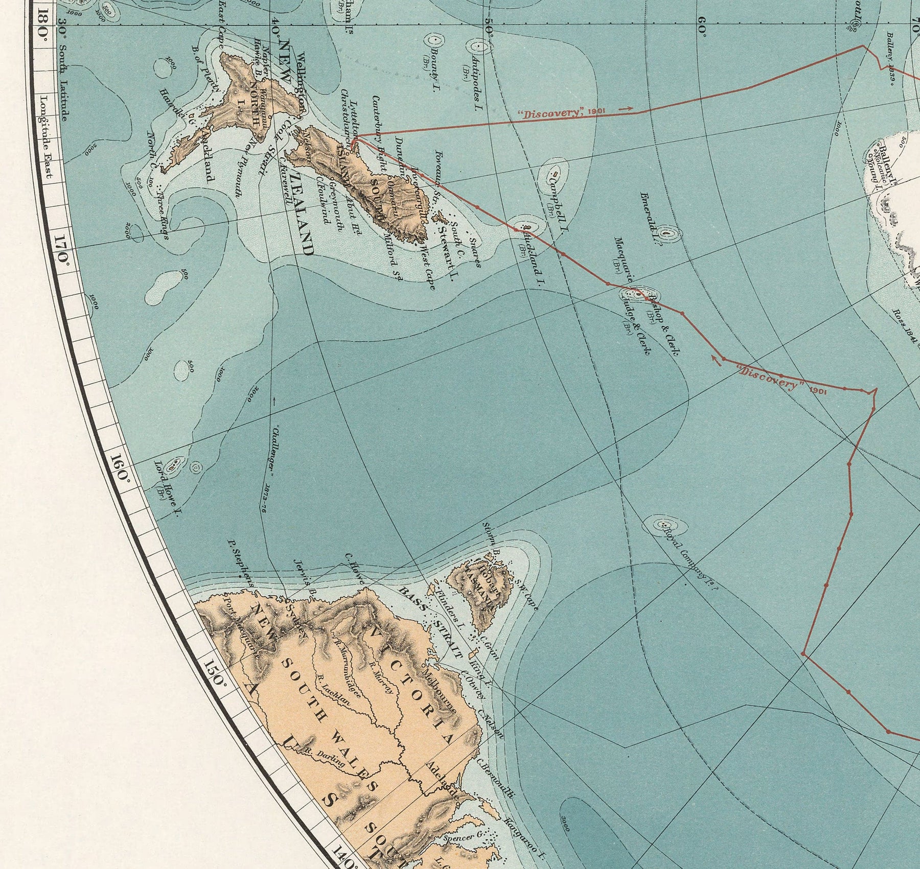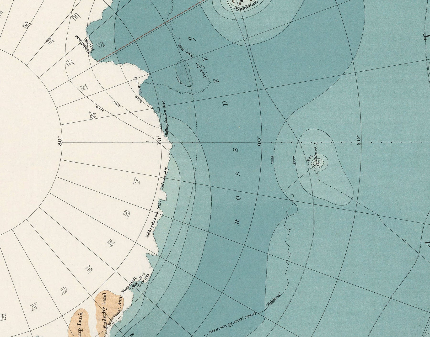 The map was first issued in 1887 with red lines and points showing the extent of humankind's exploration of antarctica. The map was then reissued every couple of years with our latest explorations marked on the map.