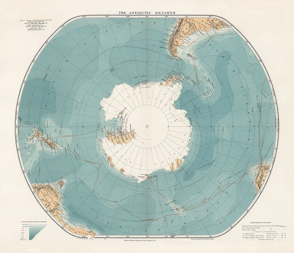 Old Antarctica South Pole Map 1904 by Stanford: Vintage Atlas Explorer Map of the Antarctic