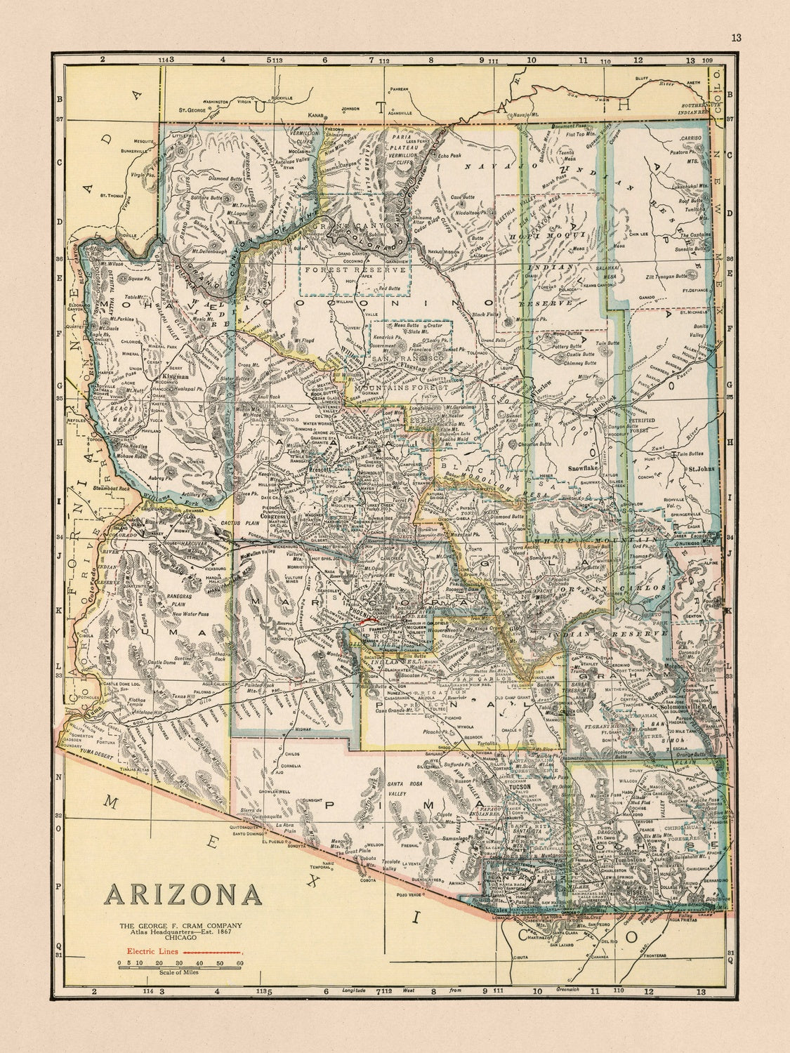 Arizona — published by the George F. Cram Company in 1920 — appears here under its original title, Arizona, composed for the Auto Trails and Commercial Survey of the United States. In a vibrant palette, the state’s counties and borders are crisply distinguished, while a web of roads and auto trails threads across desert basins and mountain uplands. State highways and principal routes are boldly drawn in red and blue, their hierarchy legible at a glance; unique color bands pick out the named auto trails that guided motorists before numbered highways. Electric lines, carefully overprinted in red, announce the new reach of power into farms, mines, and towns. Hachures lend tactile relief to the landscape, and population statistics from the 1920 census anchor each community in its moment of growth.