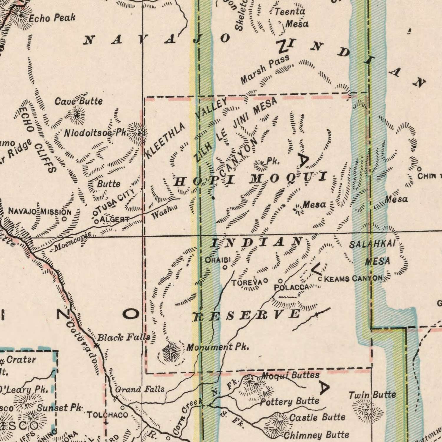 Topography is rendered with classic hachures that sweep from the Colorado Plateau’s broken escarpments to the tawny plains of the Sonoran frontier. The Mogollon Rim is beautifully modeled as a bold stair dividing high forest from low desert; the San Francisco Peaks rise above Flagstaff, while the Chiricahua, Santa Catalina, and Huachuca ranges stipple the southeast. Rivers articulate the map: the Colorado carves Arizona’s western spine; the Gila gathers the Salt and Verde from the irrigated Salt River Valley; the Little Colorado traverses the north, and the Santa Cruz threads the borderlands toward Tucson and Nogales. Grand Canyon National Park, newly designated in 1919, commands the northwest, with adjacent plateaus and canyons crisply named. Such physiographic finesse frames the routes, settlements, and power lines that animate the state’s modern story.