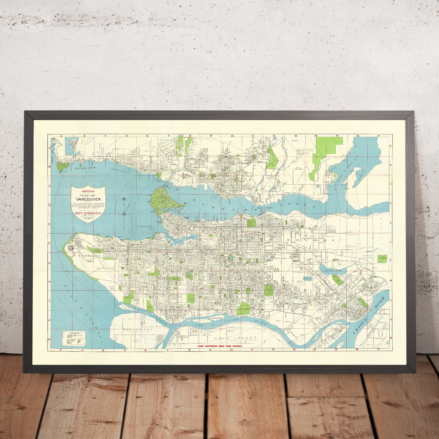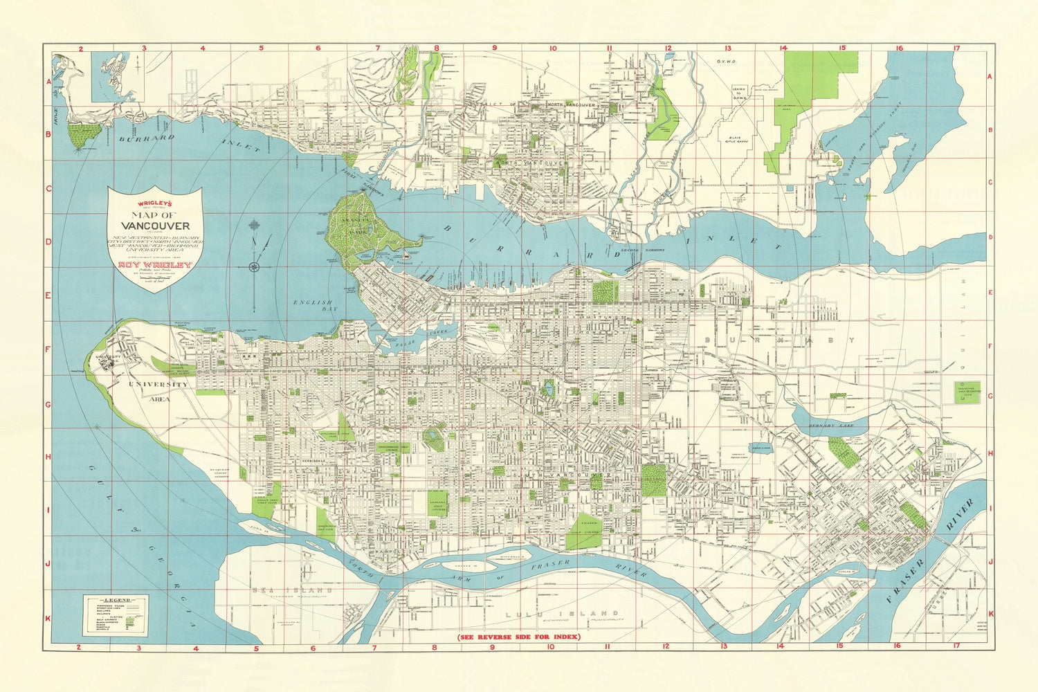 Rare Old City Map of Vancouver by Wrigley, 1947: Stanley Park, Lions Gate Bridge, Burrard Inlet, False Creek, Fraser River