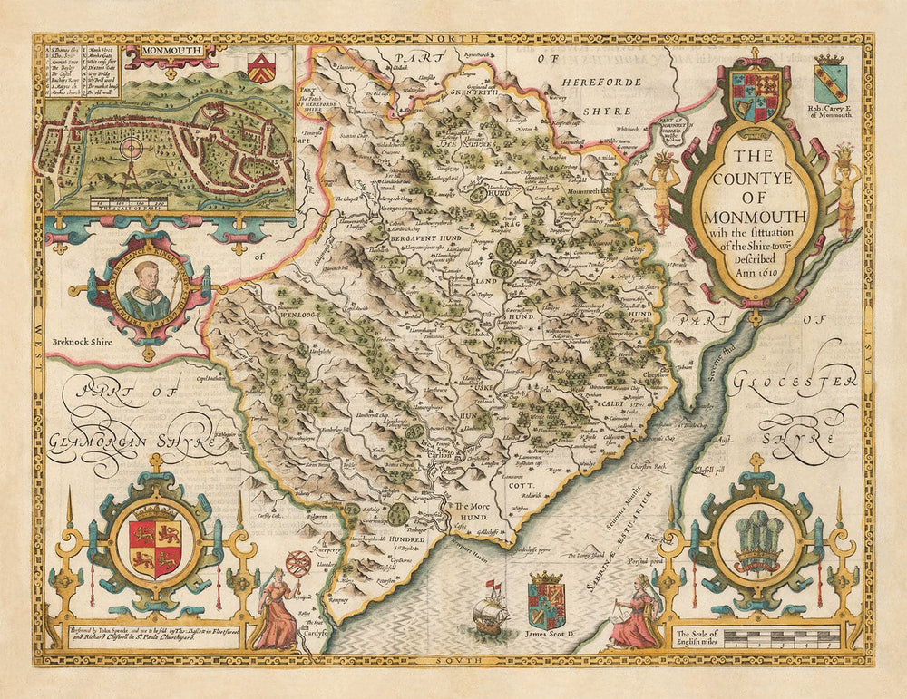 This old, full colour and exceedingly rare map shows the ancient county of Monmouthshire, Wales in 1611. It was created by John Speed and engraved by Jodocus Hondius, and originally published in Speed's "The Theatre of the Empire of Great Britaine".