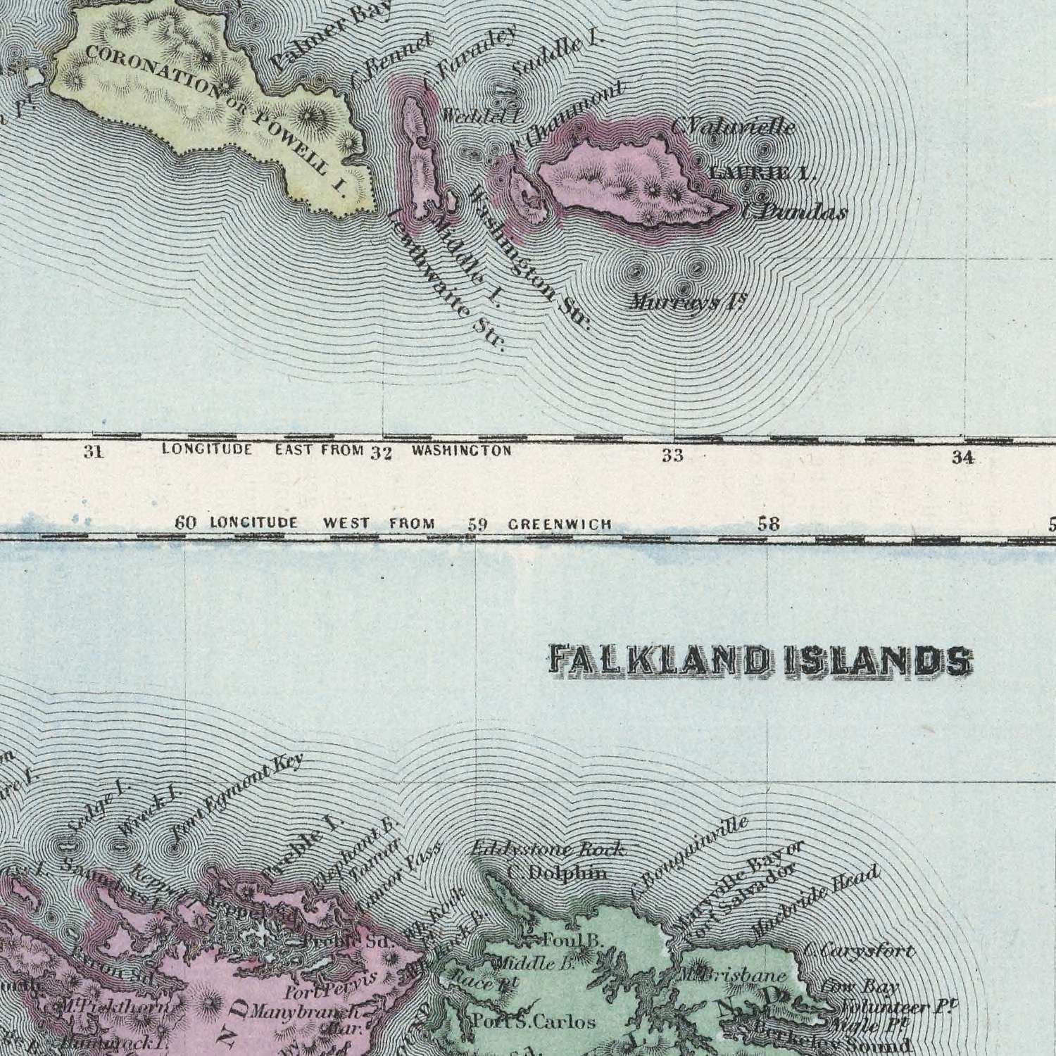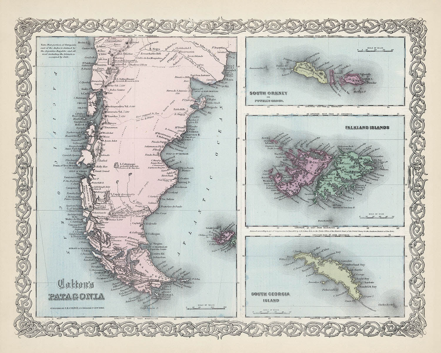 Colton's Patagonia. South Orkney or Powell's Group. Falkland Islands. South Georgia Island crystallizes a pivotal 1865 moment in J.H. Colton’s oeuvre, issued from his William Street address in New York as his firm navigated shifting partnerships and identities. Its visual grammar is unmistakable: full color articulates the political complexion of the far South, while fine hachures model a muscular terrain that pulls the eye along cordilleras, channels, and open coasts. An ornate cartouche—emblematic of Colton’s later style—frames the composition with confident flourish. Notably, two prime meridians, Greenwich and Washington, run in dialog across the sheet, a deliberate nod to parallel navigational conventions at mid-century. Insets focus the gaze on the South Orkney (Powell’s Group), the Falkland Islands, and South Georgia, sharpening the map’s engagement with exploration geographies and high-latitude seamanship.