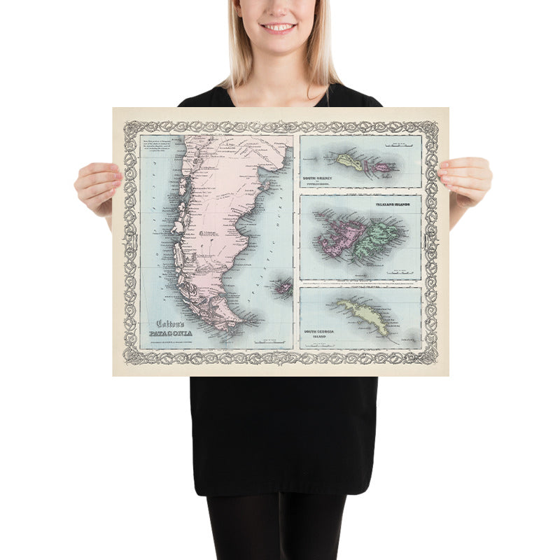 Old Map of Patagonia by Colton, 1865: Falklands, South Georgia, South Orkney Isles