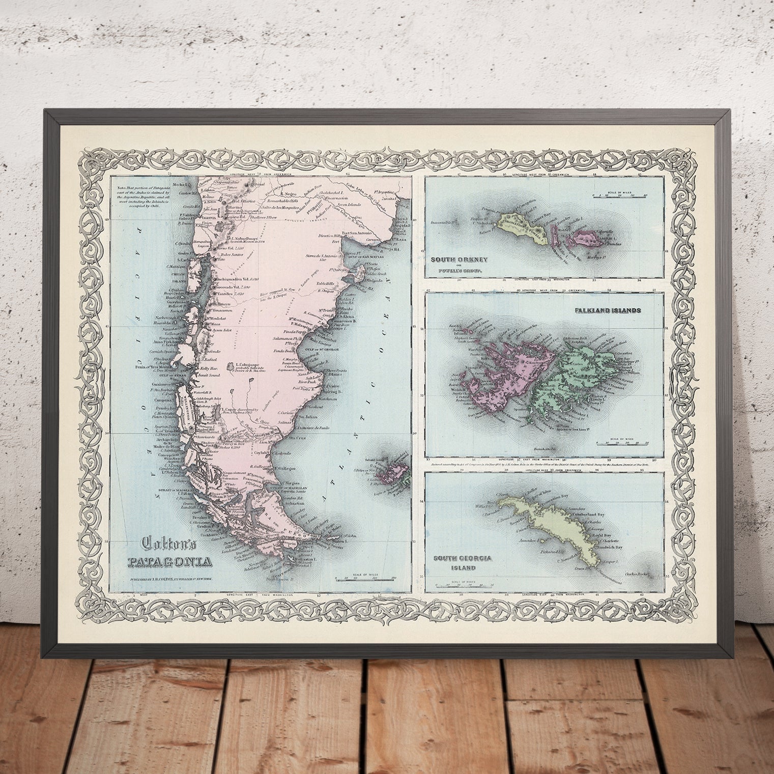 For the connoisseur, the attraction lies in this fusion of precision and poetics. Political color tells a story of borders forming at the literal edge of the world; the engraved lines supply the texture of lived geography—mountains that must be crossed, channels that may be chanced, capes that demand respect. The named towns—Punta Arenas, Puerto Natales, Río Gallegos, Ushuaia, and Stanley—are not mere labels but waypoints in a network linking Atlantic to Pacific and temperate seas to ice. Framed by Colton’s ornate cartouche and governed by twin meridians, the composition reads as both itinerary and argument: that the far South, once a marginal blank, had entered the consciousness of statesmen, mariners, and mapmakers—and here receives a rendering equal to its stark magnificence.