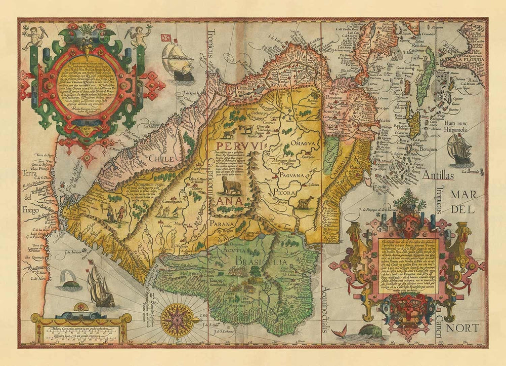 One of the oldest and most beautiful maps of South America, this was published by Dutch grandmaster Jan Huygen Van Linschoten in 1596.