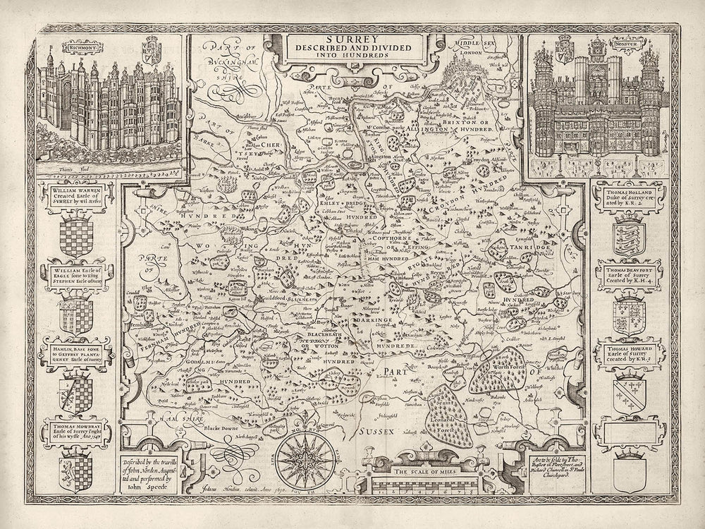 Many of the towns, villages and cities in Surrey are already visible in this map. Curiously, there are engravings of two palaces that no longer exist: Richmond Palace in the top left and Nonsuch Palace in the top right. Both were Tudor palaces back in the 1500s.