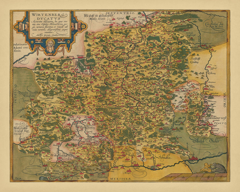 Abraham Ortelius's "Wirtenberg Ducatus Accurata descriptio," crafted in 1587, is a masterful depiction of the Duchy of Württemberg, a historical territory in southwestern Germany. This exquisite map captures the essence of 16th-century cartography, showcasing Ortelius's meticulous attention to detail and his pioneering contributions to the field. As a central figure in the renaissance of cartography, Ortelius's work on this map reflects his dedication to creating a comprehensive and accurate representation of the region, which was undergoing significant changes due to the Protestant Reformation.