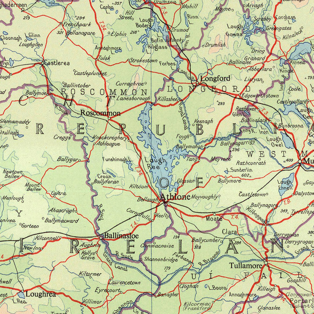 Mid-century Ireland’s political contours are presented with discretion and authority. The line dividing Northern Ireland from the Republic is crisply drawn yet integrated within the broader provincial framework of Ulster, Connacht, Leinster, and Munster, avoiding visual stridency while retaining absolute clarity. Cities and county towns—Dublin’s capital primacy, Cork’s mercantile heft, Limerick’s estuarial command, Galway’s Atlantic gateway—are woven together by an intricate hierarchy of trunk and secondary roads that predates the motorway age, illuminating historic corridors of trade and travel. Ports and river mouths are placed with navigational precision, while county and parish names settle into the landscape with Bartholomew’s famously disciplined typography, making dense information feel effortlessly navigable.