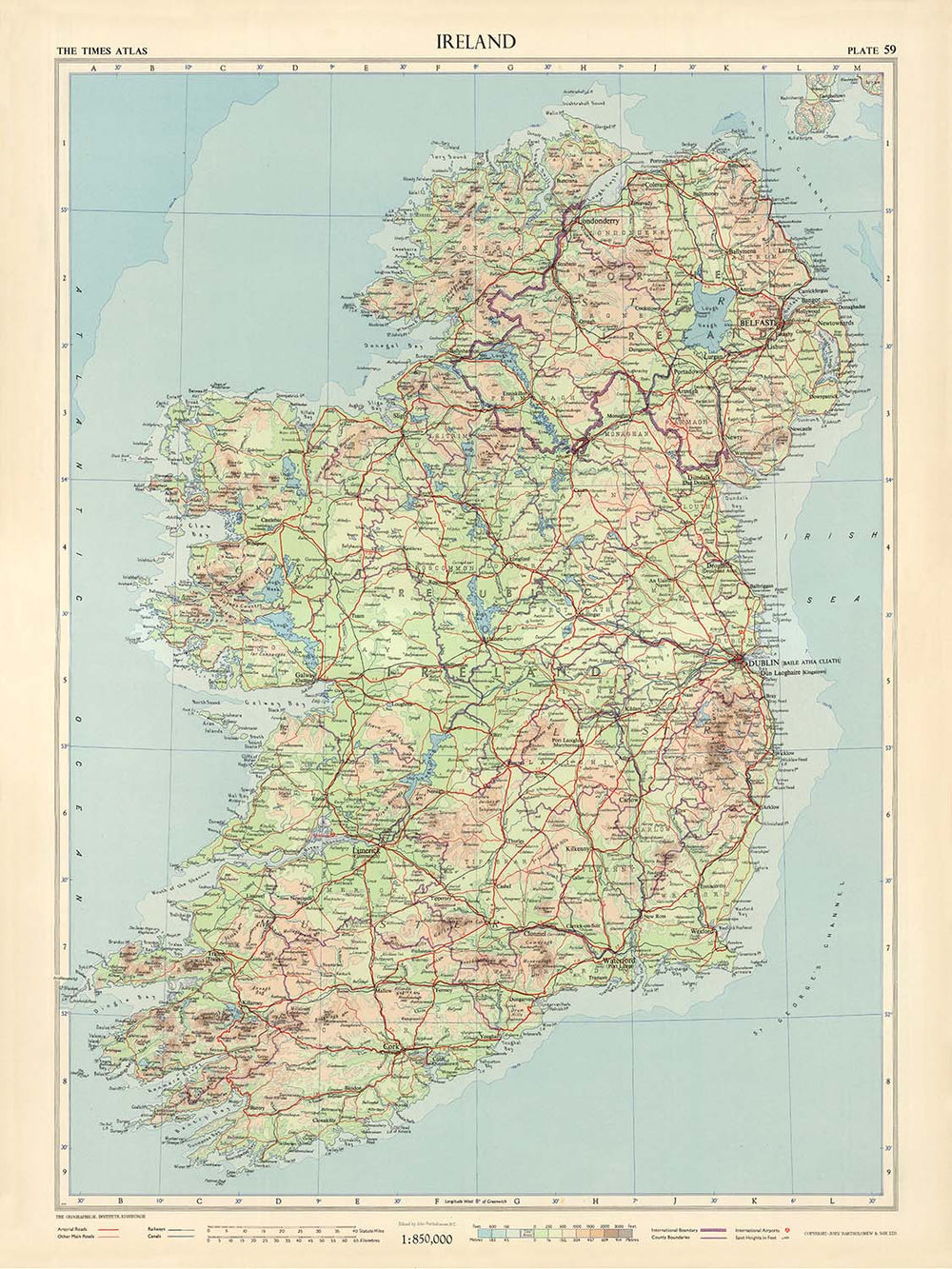 Ireland, Plate 59, V. III presents a poised mid-century portrait of the island, drawn in 1955 under the exacting eye of John Bartholomew for The Geographical Institute, Edinburgh. It is a political and physical synthesis: provinces and borders delineated with crisp assurance, while a sophisticated scheme of gradient tints and spot heights sculpts the uplands and plains. Depth is treated with equal finesse, coastal waters around the Atlantic, the Irish Sea, and the North Channel subtly stepped by soundings and marine tints. A finely graded road network—major routes and secondary ways alike—threads the cities and market towns from Dublin to Cork, Limerick to Galway, Waterford to Wexford, with Kilkenny, Sligo, Derry, Armagh, Antrim, and Louth also clearly set. The Greenwich prime meridian governs the longitudinal framework, signaling a work that marries global standards to local precision.