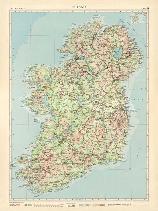 This sheet sits within The Times Atlas of the World, Mid-Century Edition, a five-volume achievement that gathered 122 expertly edited maps into a coherent cartographic statement about the modern world. Its companion index—over 200,000 names strong—locks seamlessly to the alphanumeric references along the margins of the plate, enabling the user to locate the smallest townland as readily as the largest city. A tasteful cartouche frames the title and publisher, a quiet flourish that underscores the map’s authority. For collectors, historians, and geography enthusiasts, it captures the aesthetic and method of 1950s cartography: empirically exact, beautifully restrained, and composed to reward both quick consultation and lingering study.