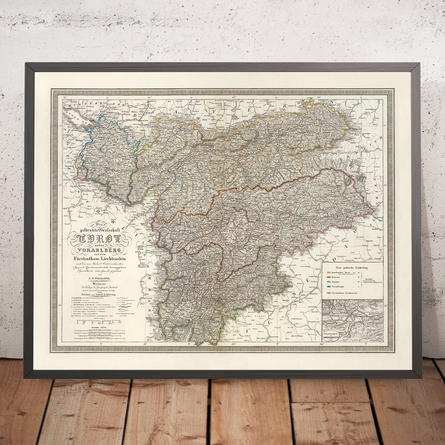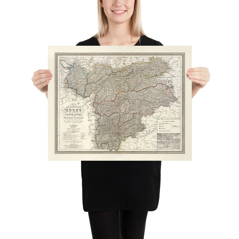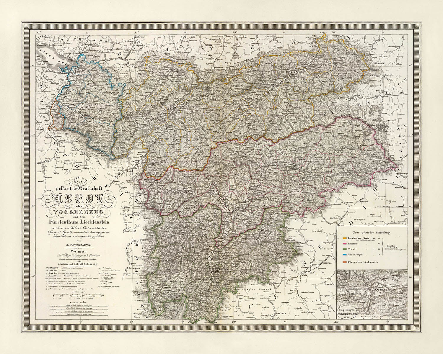 C.F. Weiland’s 1856 Die gefuerstete Grafschaft Tyrol nebst Vorarlberg und dem Furstenthum Liechtenstein offers a masterfully engraved portrait of the central Alps at a moment of profound strategic and administrative clarity. Issued under the auspices of the Militar-Geographisches Institut in Weimar, it unites the Principality of Tyrol, Vorarlberg, and the diminutive yet sovereign Liechtenstein within a single, authoritative vista. Fine hachures articulate the dramatic relief, while hand coloring distinguishes political and district boundaries with elegant restraint. The ornate cartouche announces its official pedigree and scholarly intent. A dense fabric of toponyms—Innsbruck and Schwaz in the Inn valley, Bregenz on Lake Constance, and Vaduz and Feldkirch along the Rhine frontier—anchors the map’s geographic intelligence in lived places.