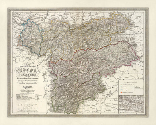 A refined inset at the scale of 1:144,000 provides a magnified study of a critical corridor, sharpening the already exacting relief and boundary work for practical use—be it by staff officers, engineers, or provincial administrators. Together with the map’s luxuriant engraving and balanced hand coloring, it exemplifies the period’s highest cartographic standards. Historically, it captures the geopolitical equilibrium of Tyrol, Vorarlberg, and Liechtenstein before later boundary realignments and industrial acceleration reshaped the region. As a document of science and statecraft in concert, it offers collectors and historians a rare synthesis: an Alpine panorama where every contour, frontier, and town name speaks to power, terrain, and the enduring logic of place.
