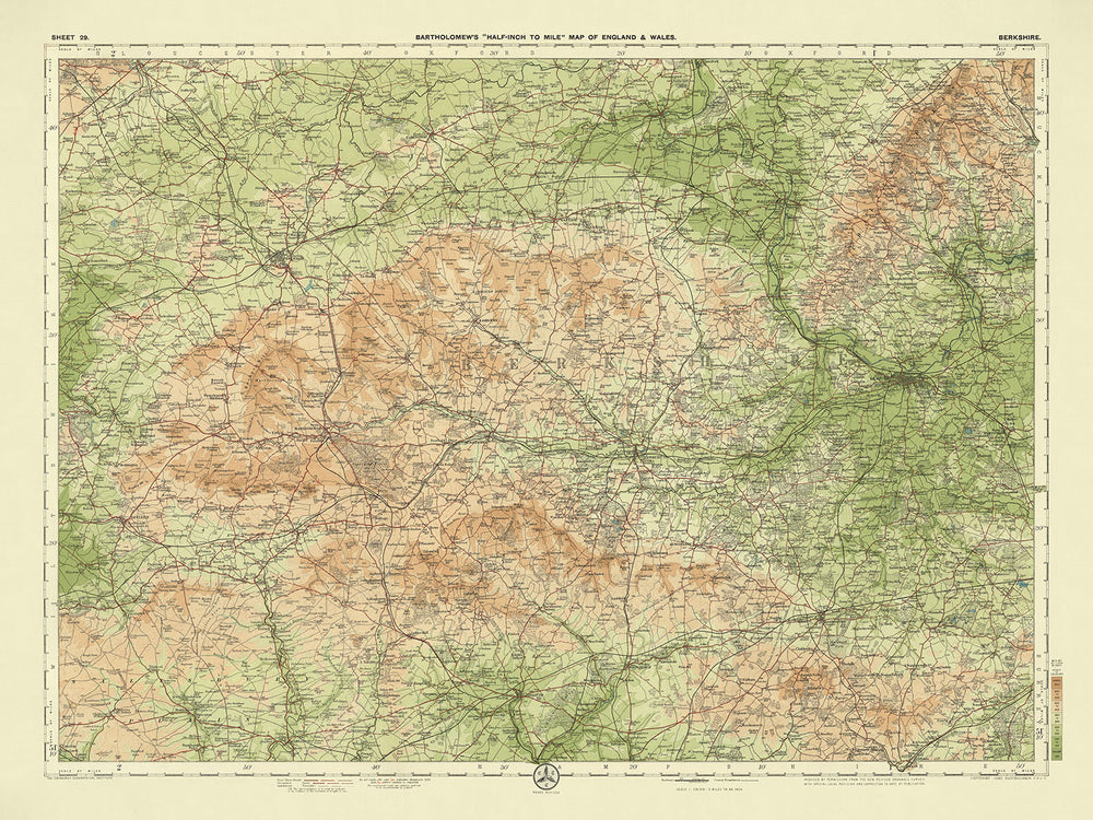 Sheet 29 - Berkshire, created by the esteemed J.G. Bartholomew in 1901, is a stunning example of early 20th-century cartography. Bartholomew, a renowned Scottish cartographer, was celebrated for his meticulous attention to detail and innovative use of color. This map, part of his flagship half-inch to the mile series, showcases the intricate political and physical landscape of Berkshire with unparalleled clarity. The map's vibrant color layers, used to depict varying elevations, not only enhance its aesthetic appeal but also provide a practical tool for cyclists and tourists of the Edwardian era.