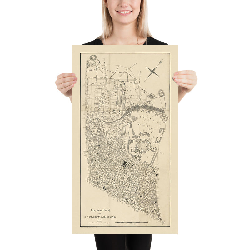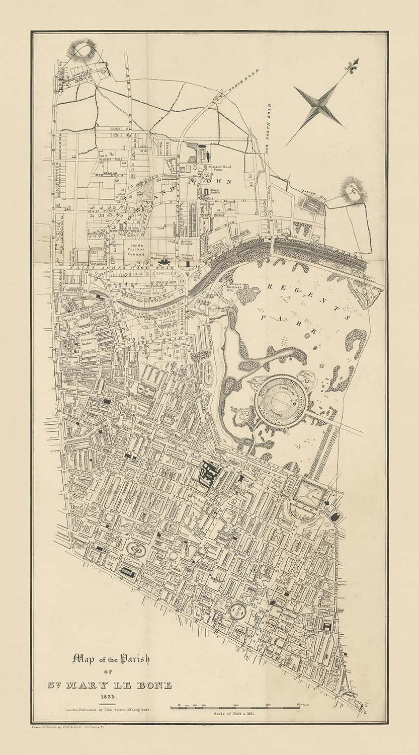 Map of the Parish of St Marylebone (1833) by Graf & Soret presents an exquisitely articulated portrait of London on the cusp of profound change. Rendered in elegant monochrome, its engraved lines capture Marylebone, Fitzrovia, Lisson Grove, and St John’s Wood just before railways reorder the city’s rhythms, preserving a street-by-street account of pre‑industrial urbanity. The grid of Great Marylebone Street, New Cavendish Street, Weymouth Street, and Dorset Street resolves into the more sinuous patterns of Lisson Grove and the new suburban plots to the north, while the New Road from Paddington frames the parish’s edge. As a city map, it is notable for the way it fuses topographic precision with civic life—street architecture, institutions, and pleasure grounds all held in a single, legible design.