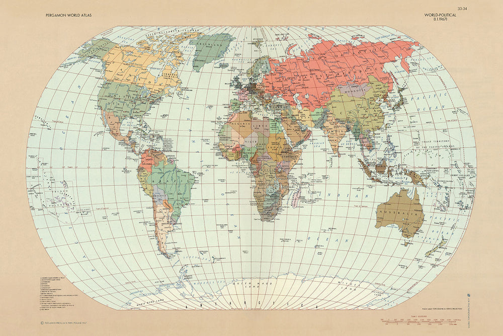 Old Political World Map, 1967: Cold War Era, Detailed Political Boundaries