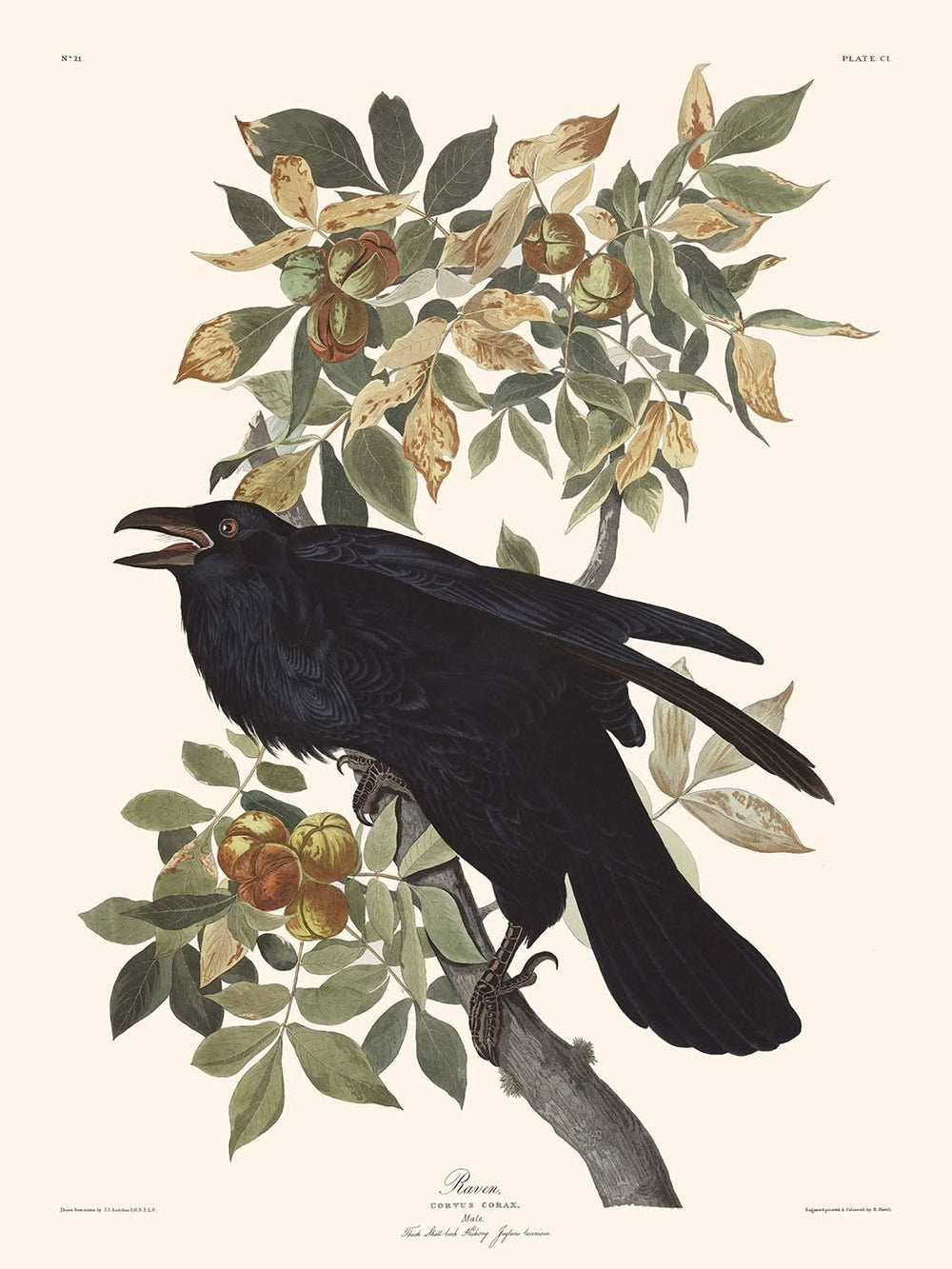 Raven, first published in 1827, is a captivating and intricately detailed illustration by the renowned naturalist and artist John James Audubon, originating from his monumental work, Birds of America.